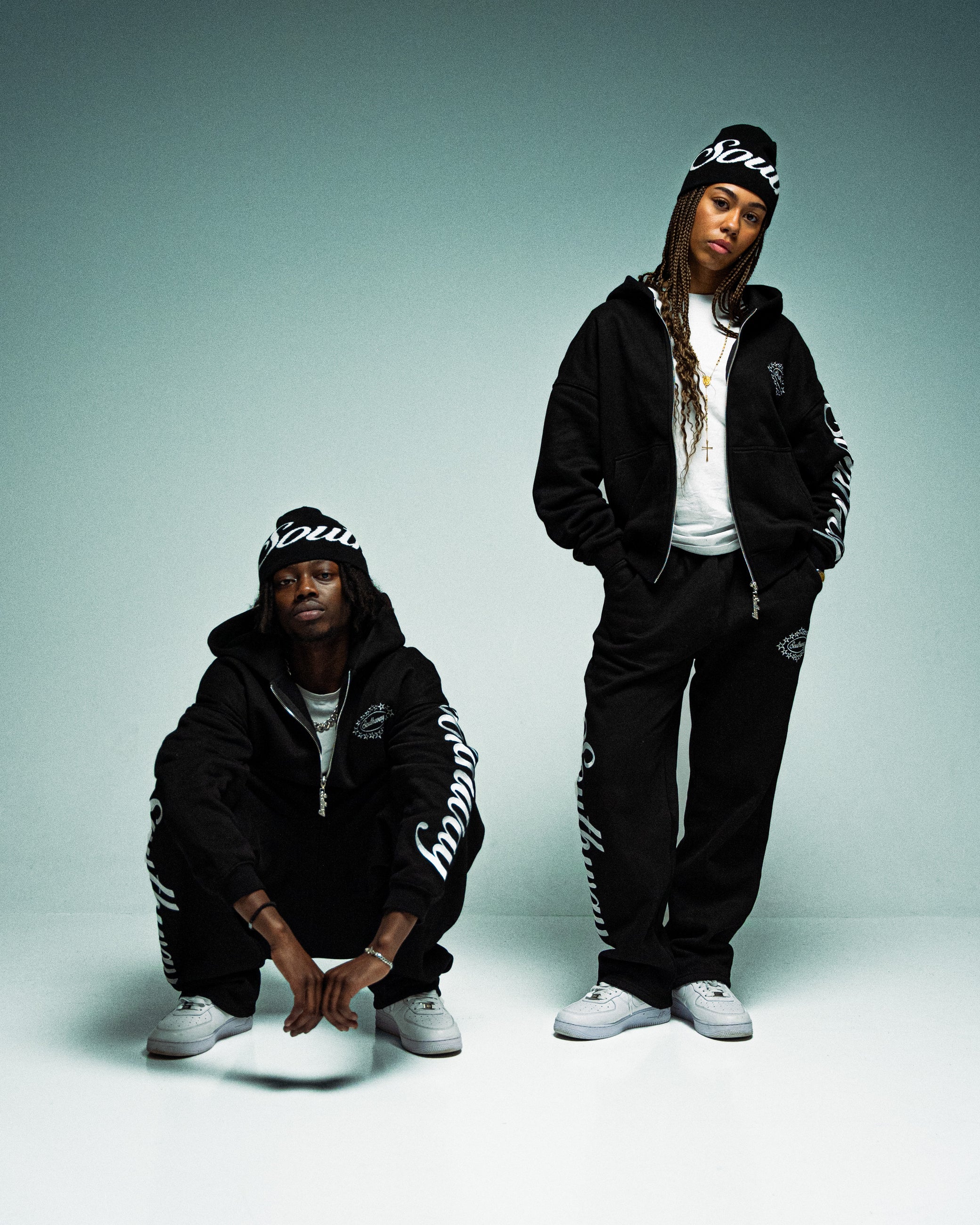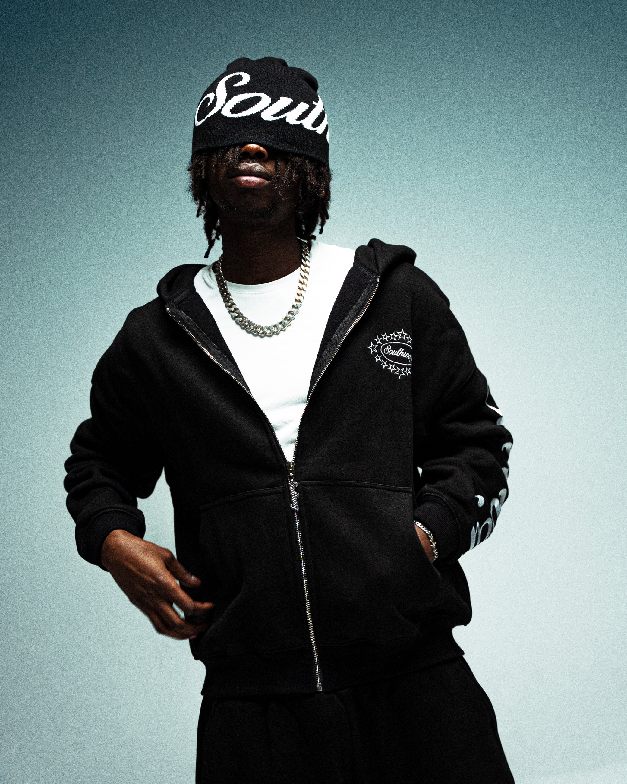 𝗦𝗧𝗢𝗡𝗘 𝗕𝗟𝗔𝗖𝗞 𝗕𝗘𝗔𝗡𝗜𝗘 CURSIVE SOUTHWAY JACQUARD LOGO WRAPPED AROUND THE BEANIE. ONE FIT FOR ALL. EVERYBODY EATS.