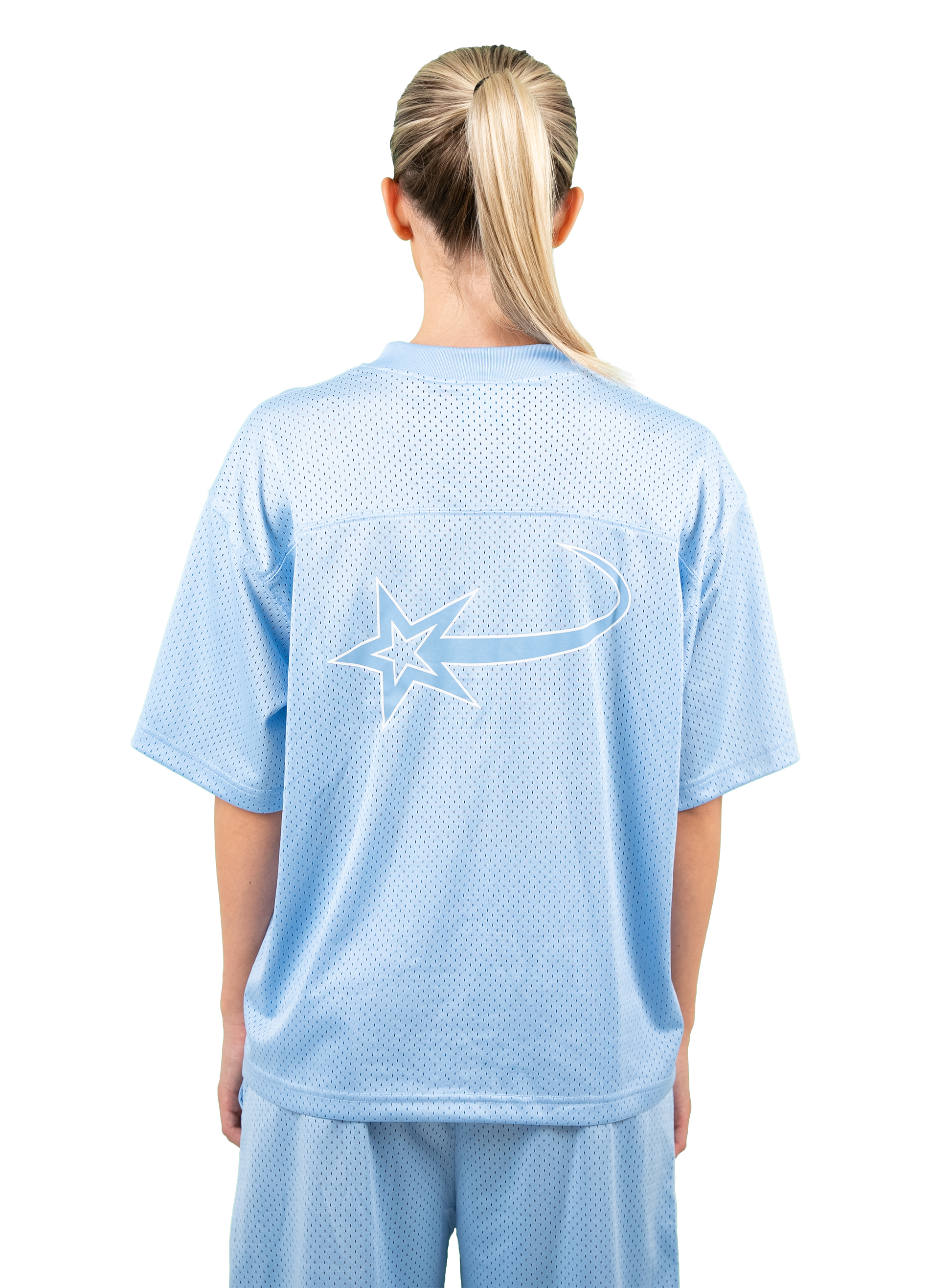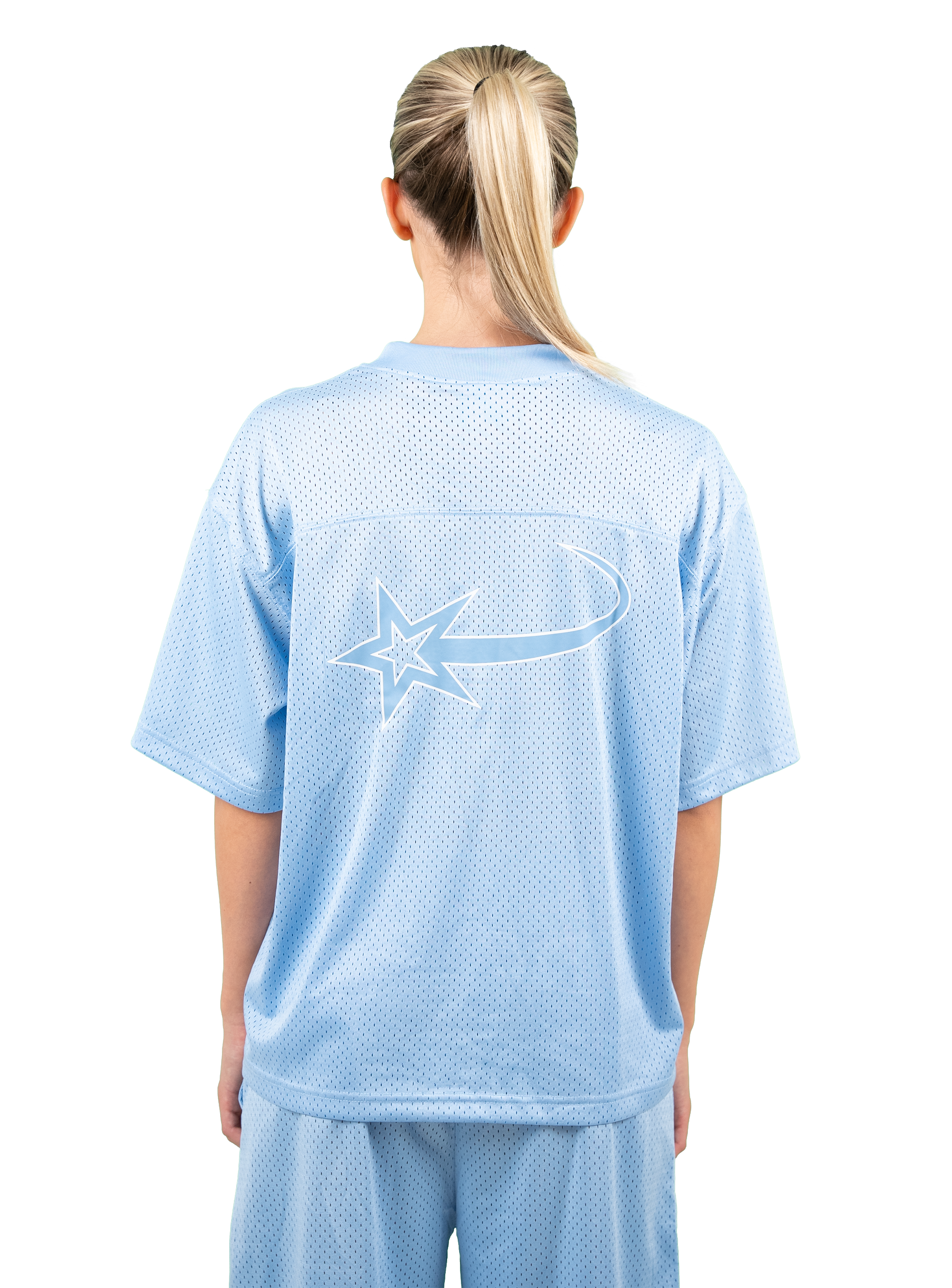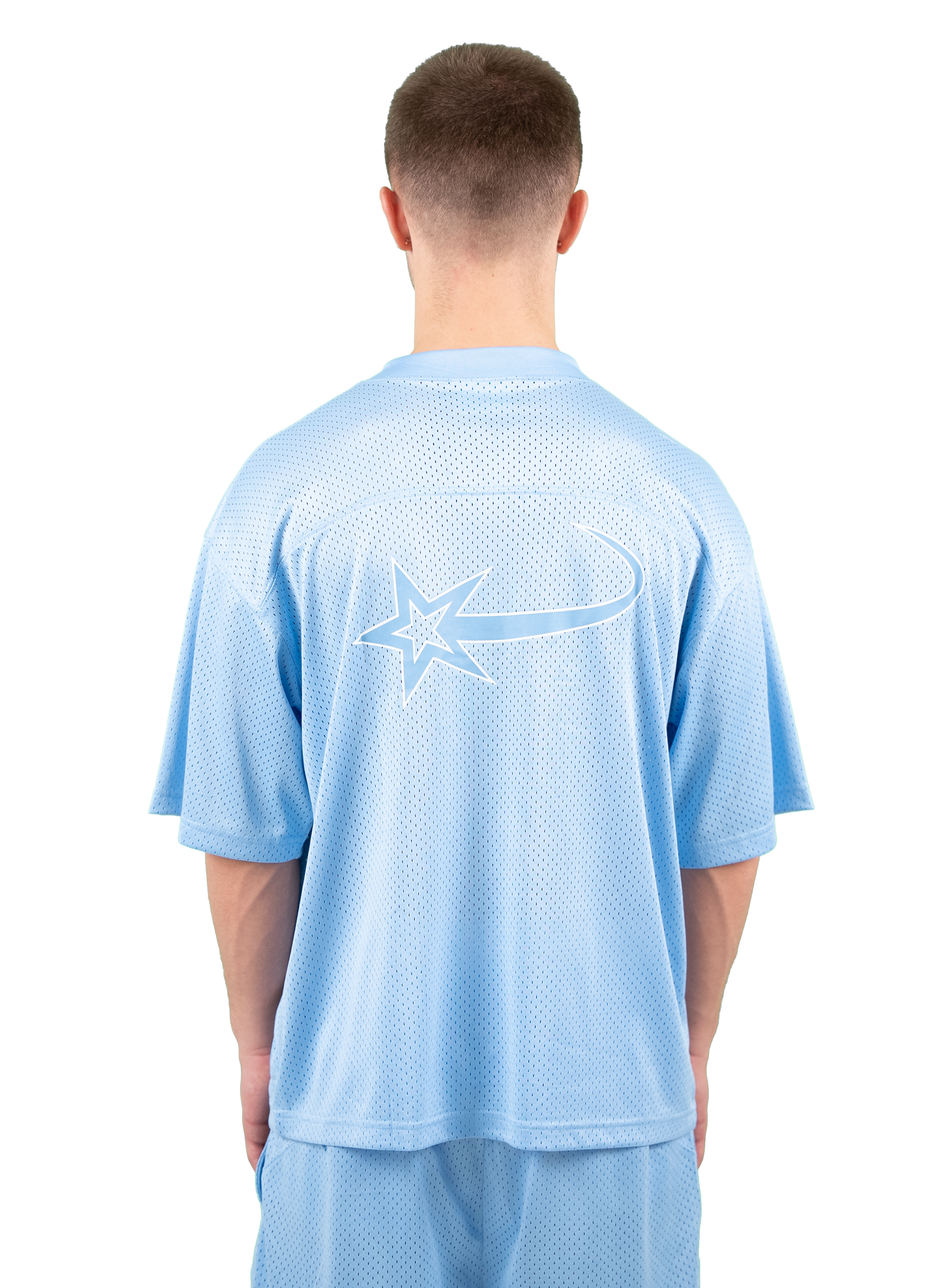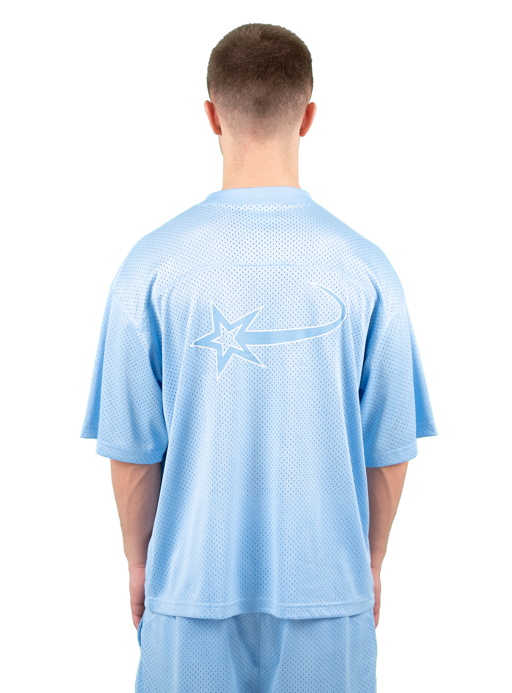 𝗕𝗔𝗕𝗬 𝗕𝗟𝗨𝗘 𝗠𝗘𝗦𝗛 𝗝𝗘𝗥𝗦𝗘𝗬 PRINTED LOGO ON DA FRONT. WOVEN LABEL ON THE BOTTOM RIGHT SIDE. SHOOTING STAR LOGO PRINTED ON DA BACK. BREATHABLE MATERIAL. NO SWEAT. 𝗠𝗔𝗧𝗘𝗥𝗜𝗔𝗟 100% POLYESTER MESH