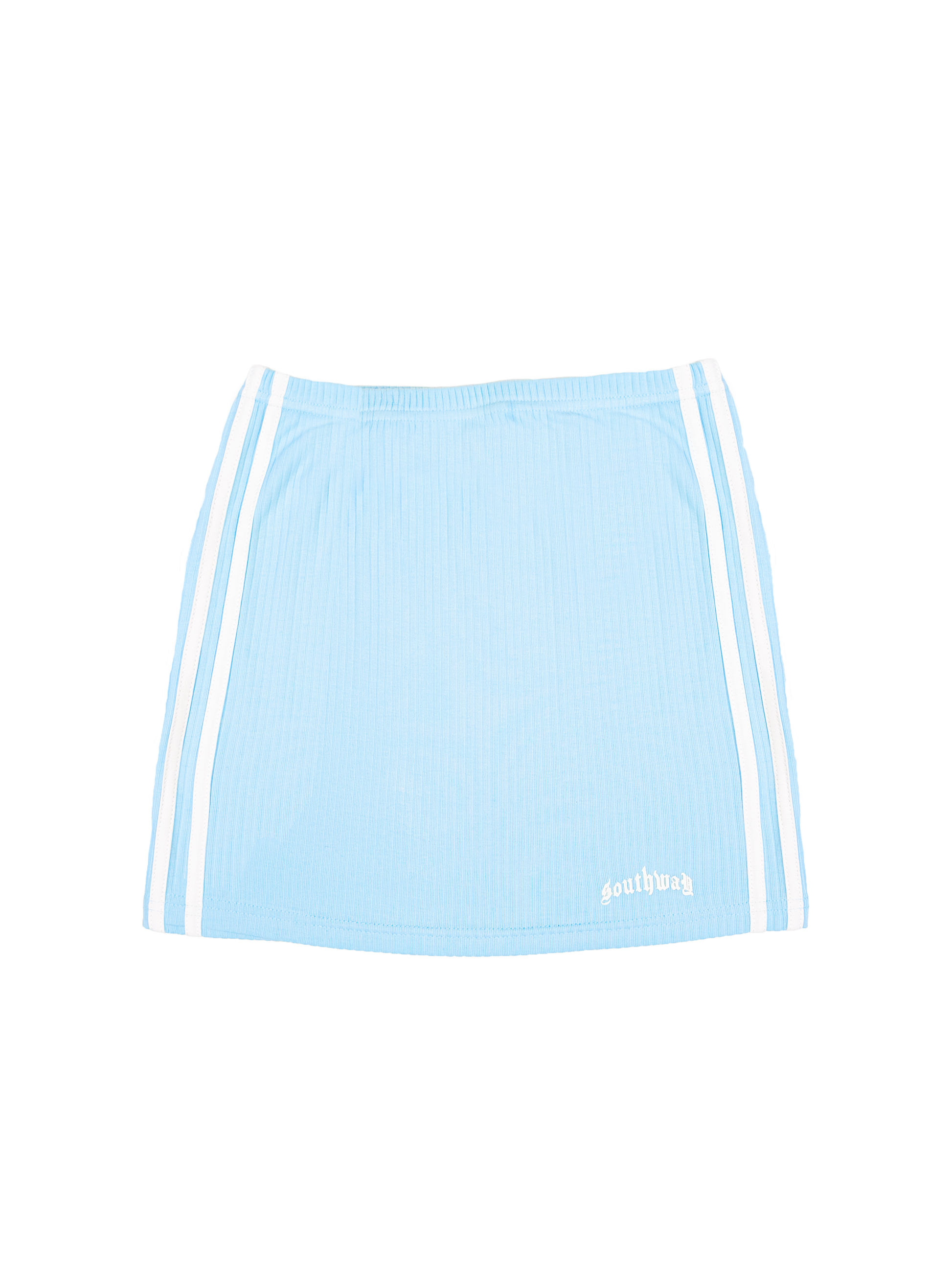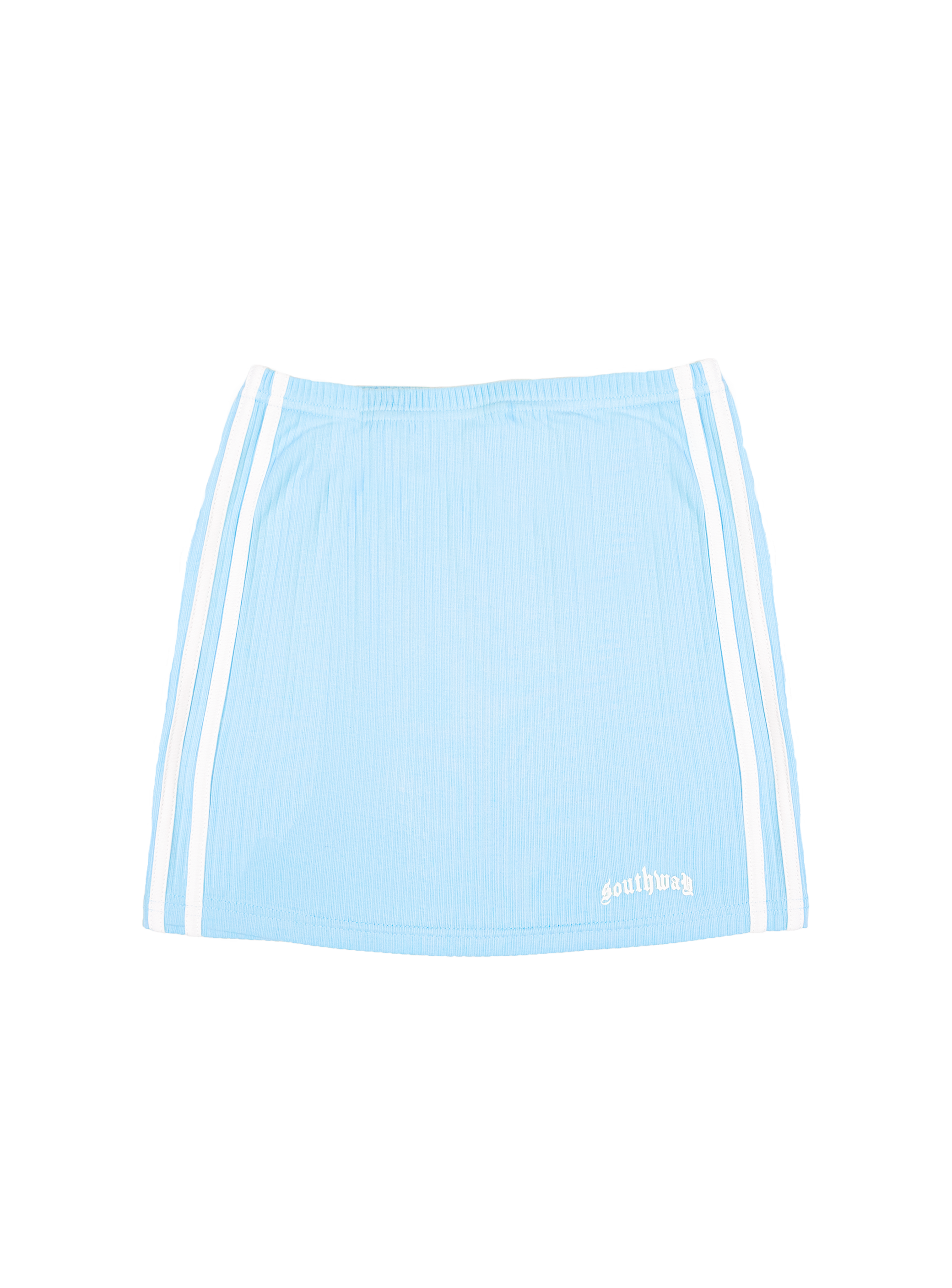 𝗕𝗔𝗕𝗬 𝗕𝗟𝗨𝗘 𝗠𝗜𝗡𝗜 𝗦𝗞𝗜𝗥𝗧 FOR THE GYALDEM. 2 WHITE STRIPES ON THE SIDES. LOGO PRINTED ON THE FRONT AND BACK. RIBBED STRETCH MATERIAL. 𝗠𝗔𝗧𝗘𝗥𝗜𝗔𝗟𝗦 95% COTTON 5% SPANDEX