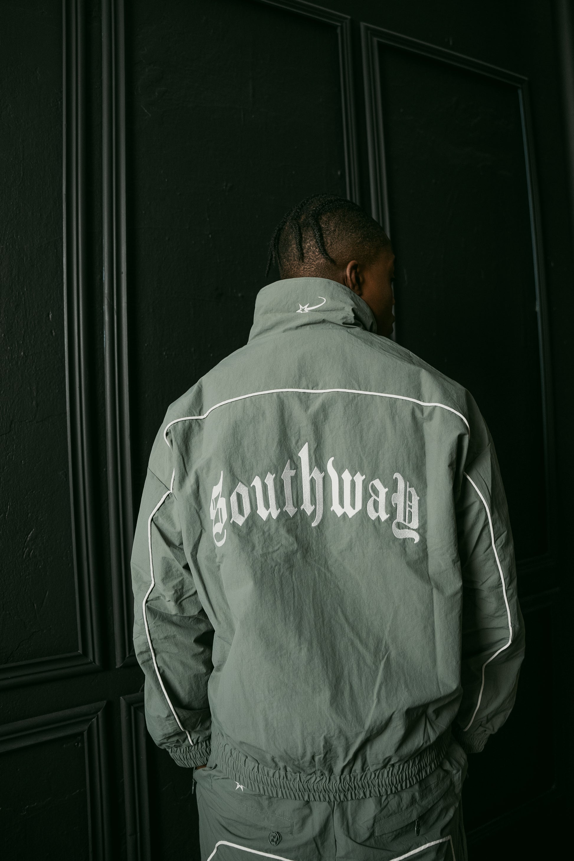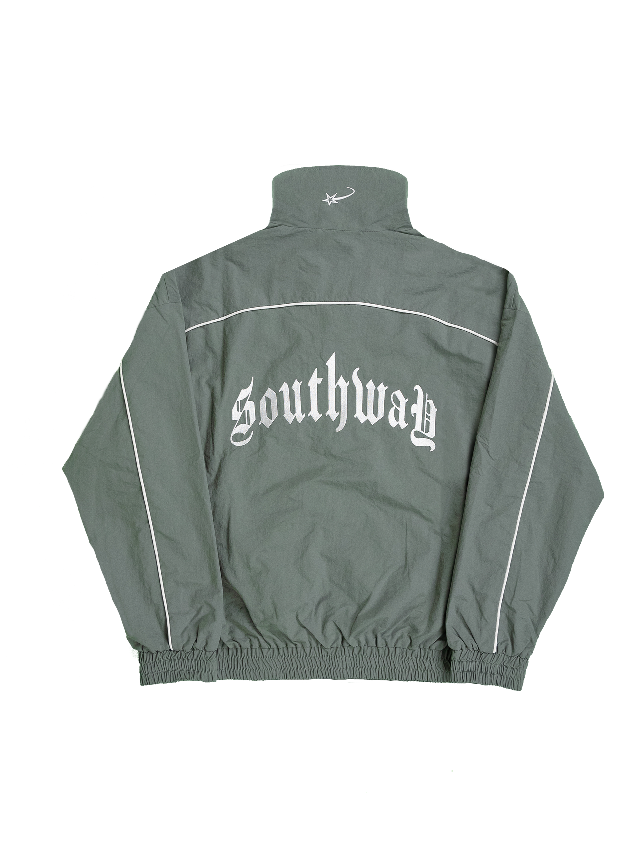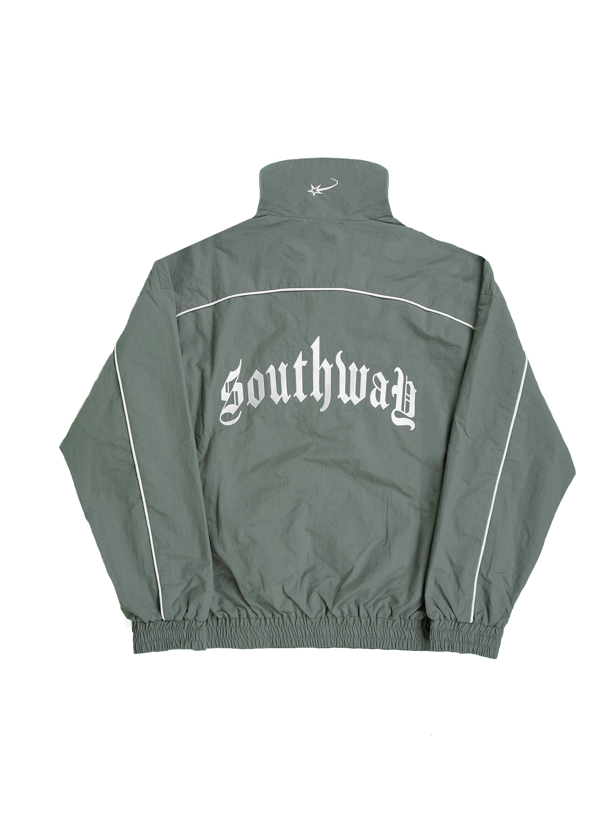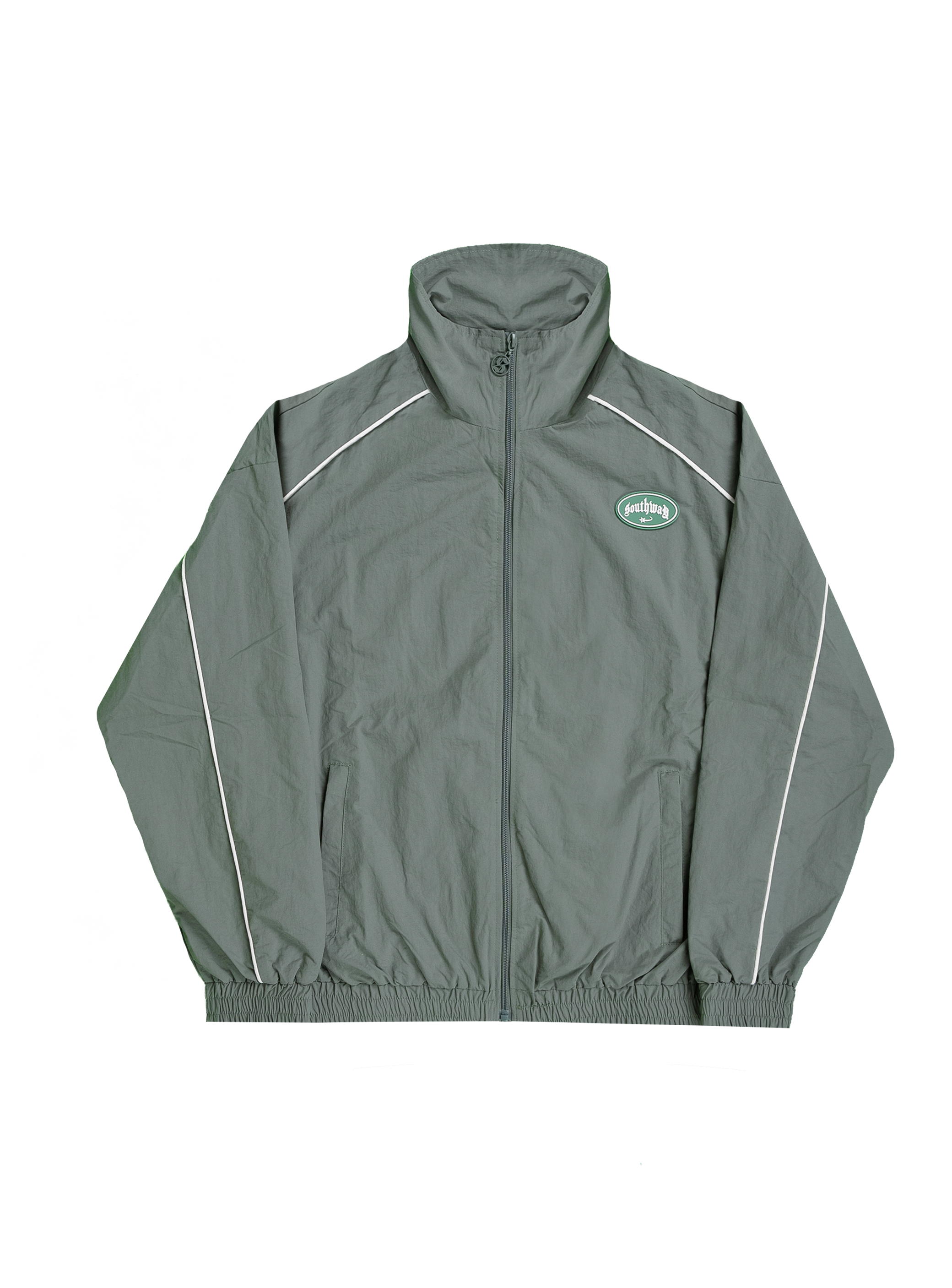 NYLON TECH JACKET IN A GREY-GREEN COLORWAY. WHITE PIPING ON THE BACK AND SLEEVES FOR A SPORTS LOOK. TWO POCKETS ON THE FRONT AND ONE ON THE INSIDE OF THE JACKET. DETAILED WITH OUR RUBBER LOGO PATCH, AS WELL AS EMBROIDERY ON THE BACK. CUSTOM "S" LOGO ZIP PULLER DOWN THE FRONT AND ON THE POCKETS.