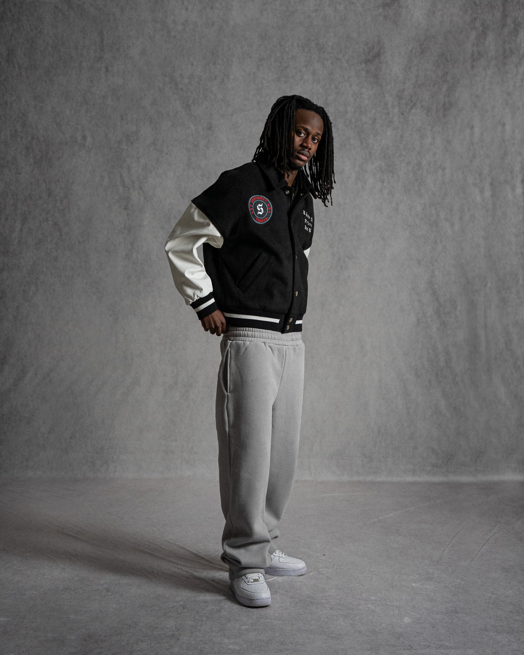 The jacket includes a collar for a classy look, white stripes on the rib and also a detailed printed "S" logo monogram on the lining of the jacket to give a luxurious feel. The buttons on the jacket are also detailed with engraving of our logo. The jacket is oversized, with a wide chest, dropped shoulders.