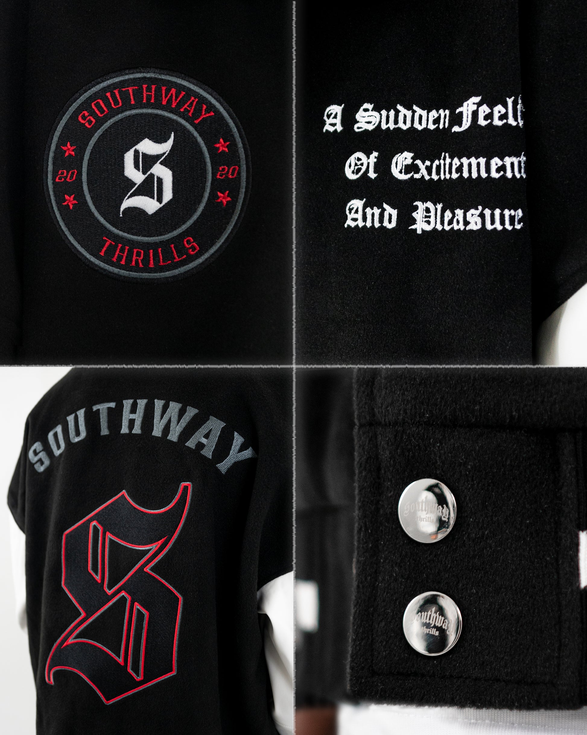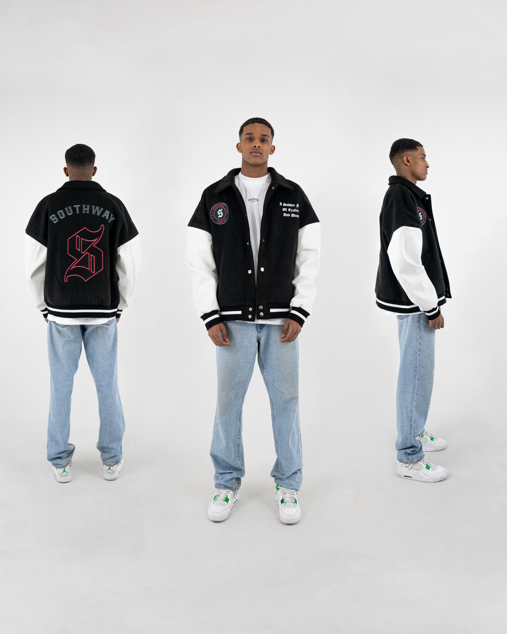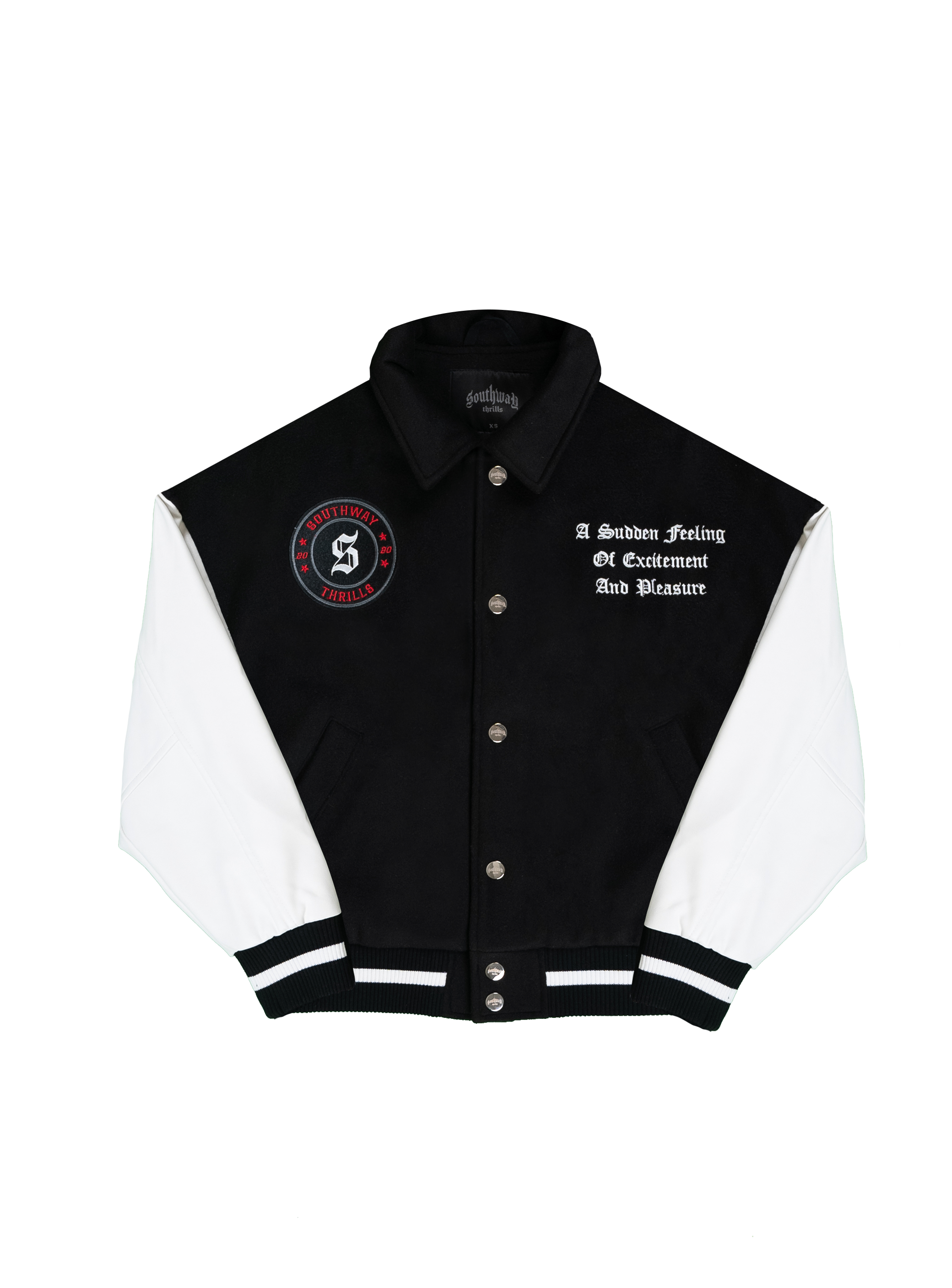 Jacket consists of a black base colour, with white sleeves. The jacket has 3 patches, one on the back and two on each side of the front of the chest of the jacket including our sports logo patch and our slogan "A sudden feeling of excitement and pleasure.