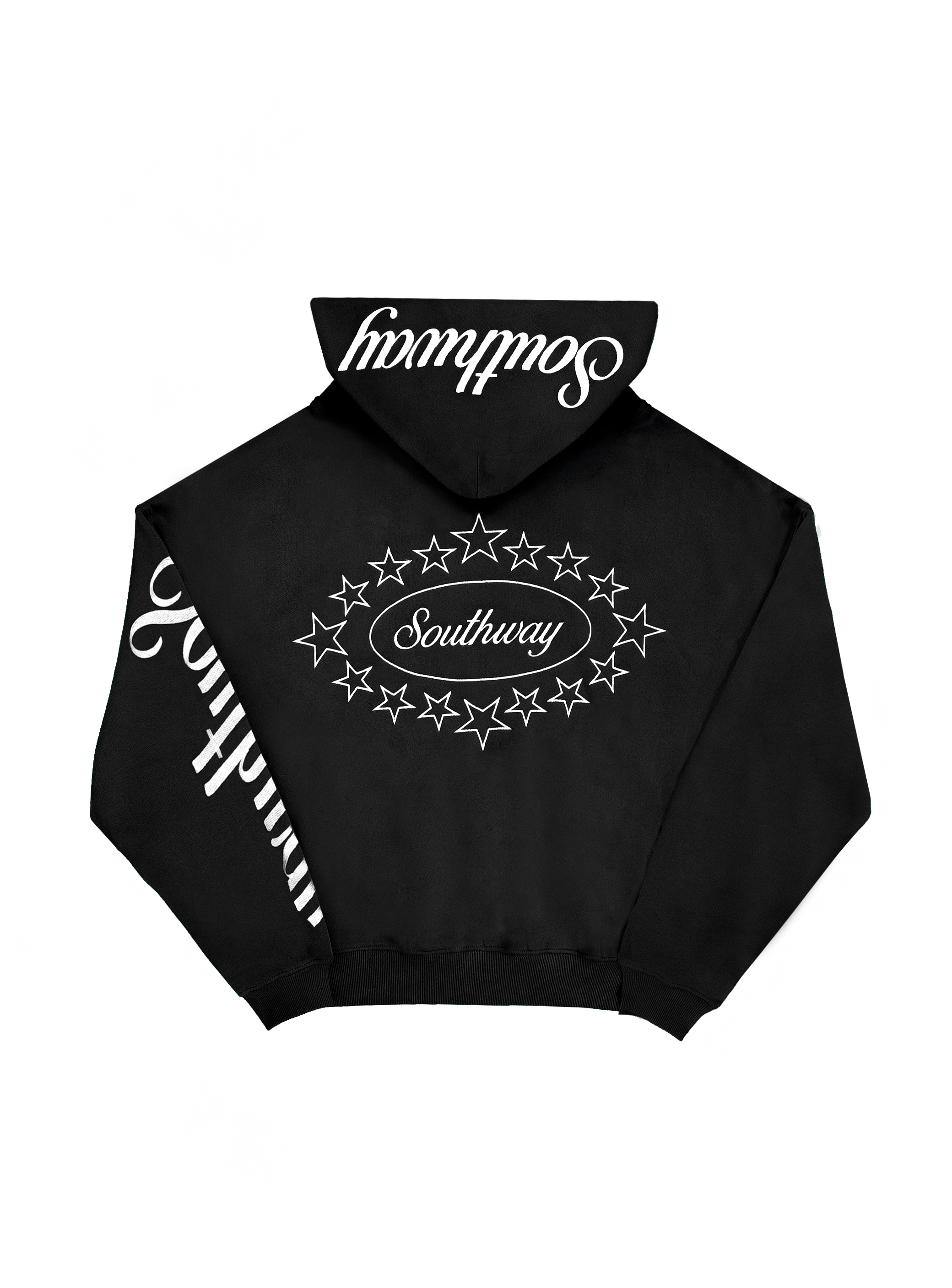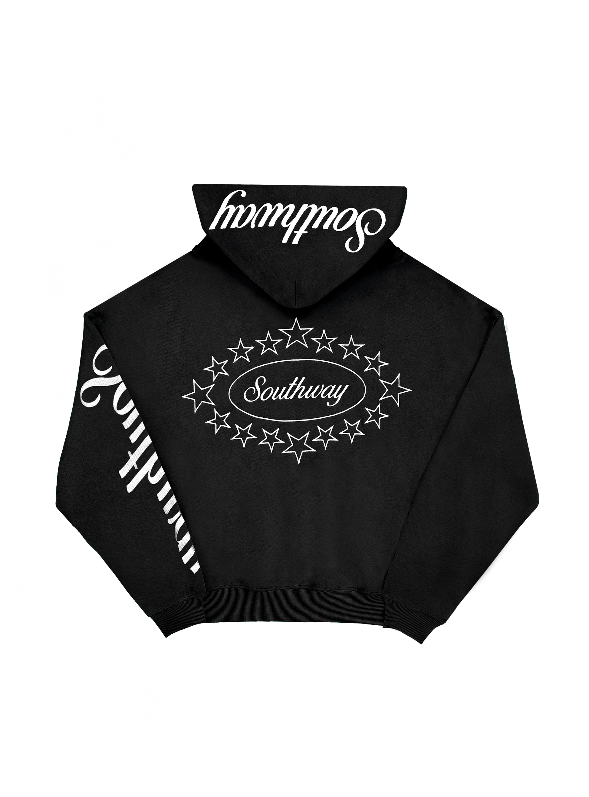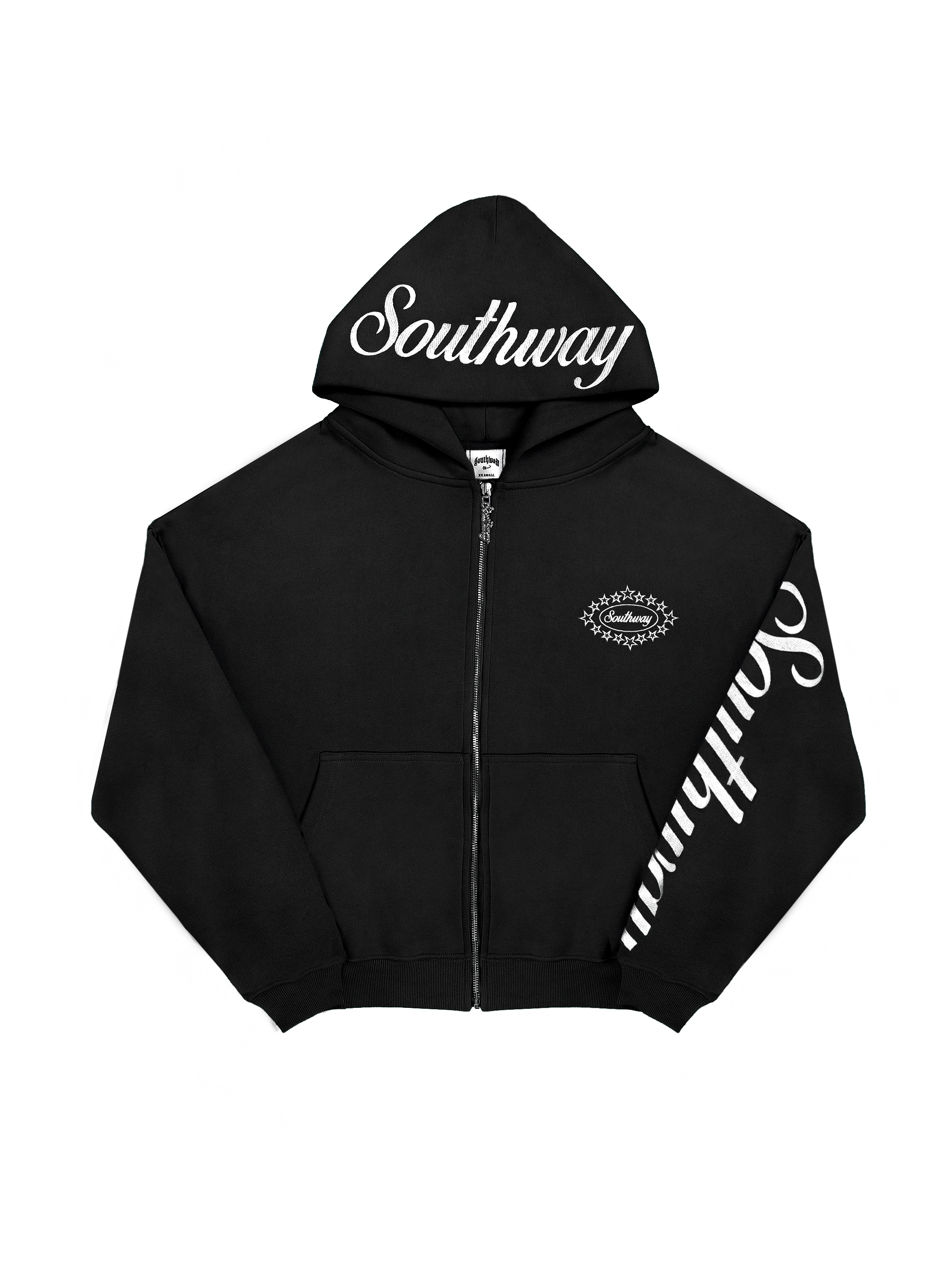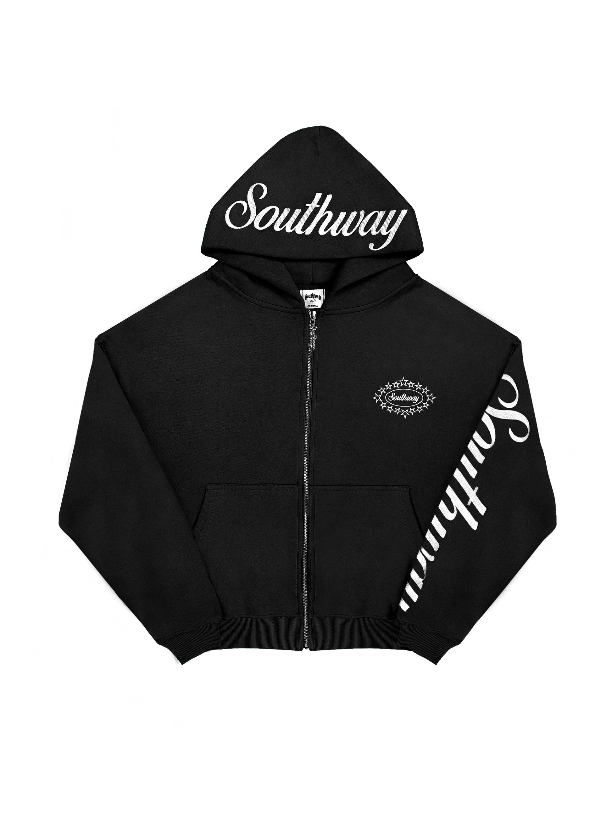 HEAVY SOUTHWAY CREST LOGO TRACKSUIT HOODIE IN A STONE BLACK COLORWAY. EMBROIDERY LETTERING ON THE SLEEVE AND HOOD. EMBROIDERED CREST LOGO ON THE CHEST AND BACK. CUSTOM ZIP LOGO PULLER IN SILVER.