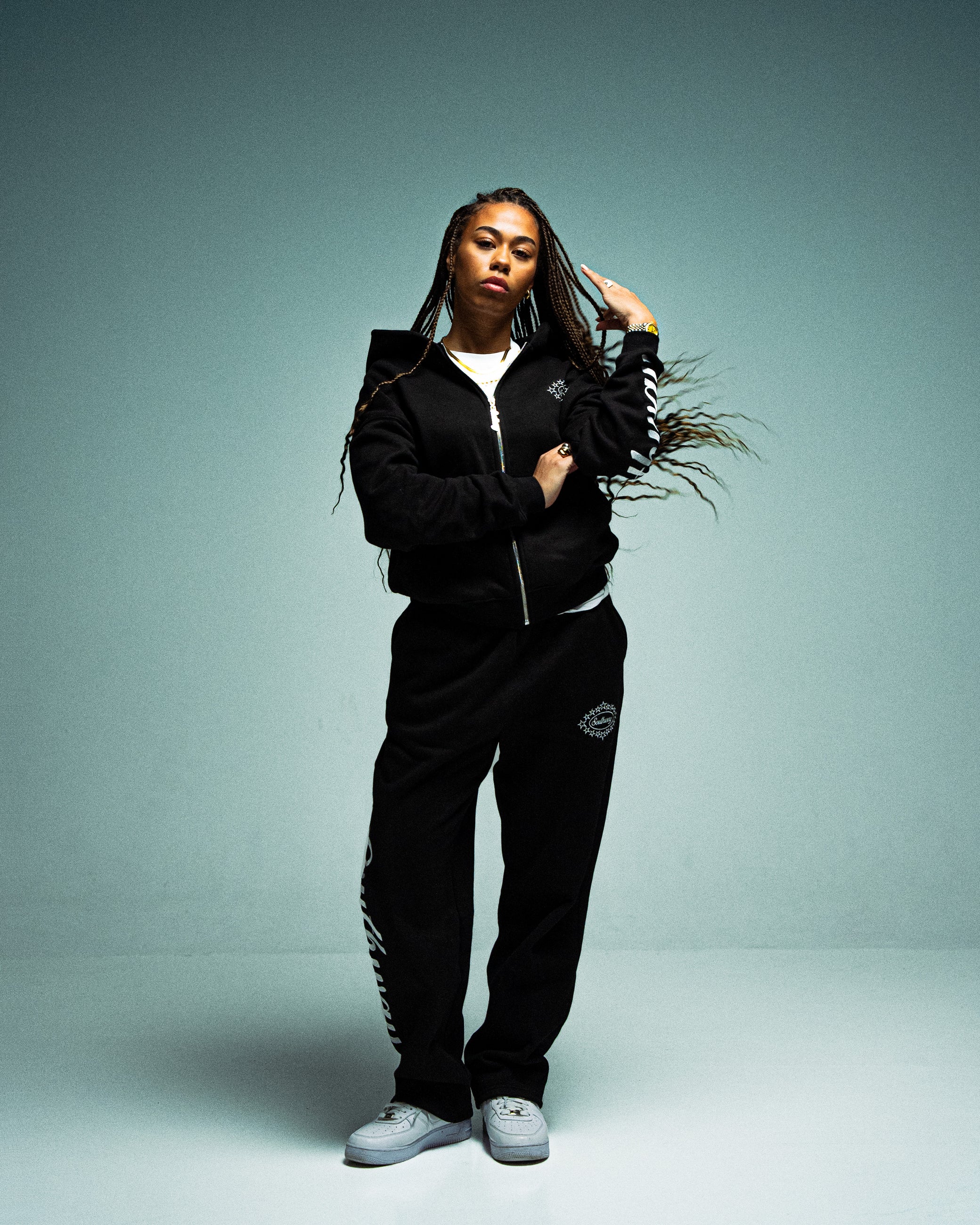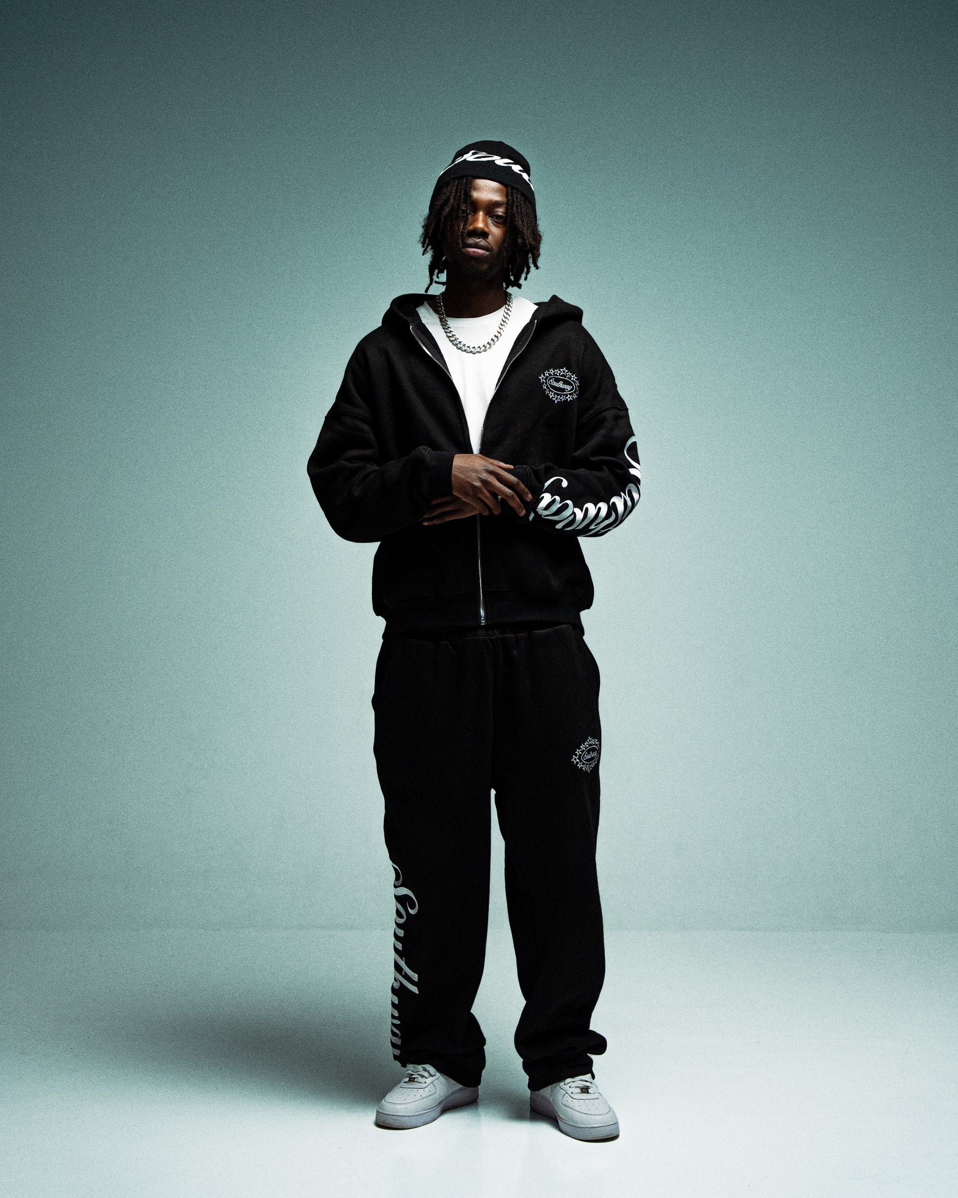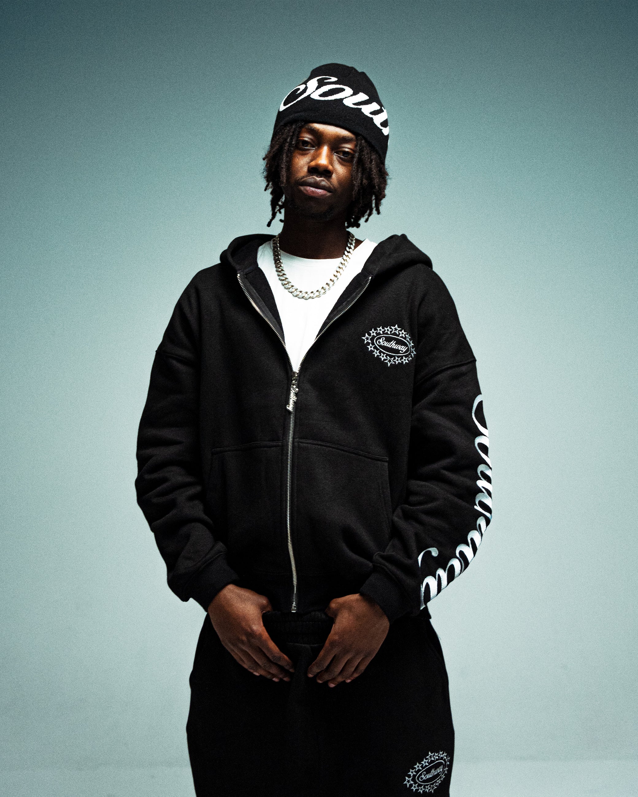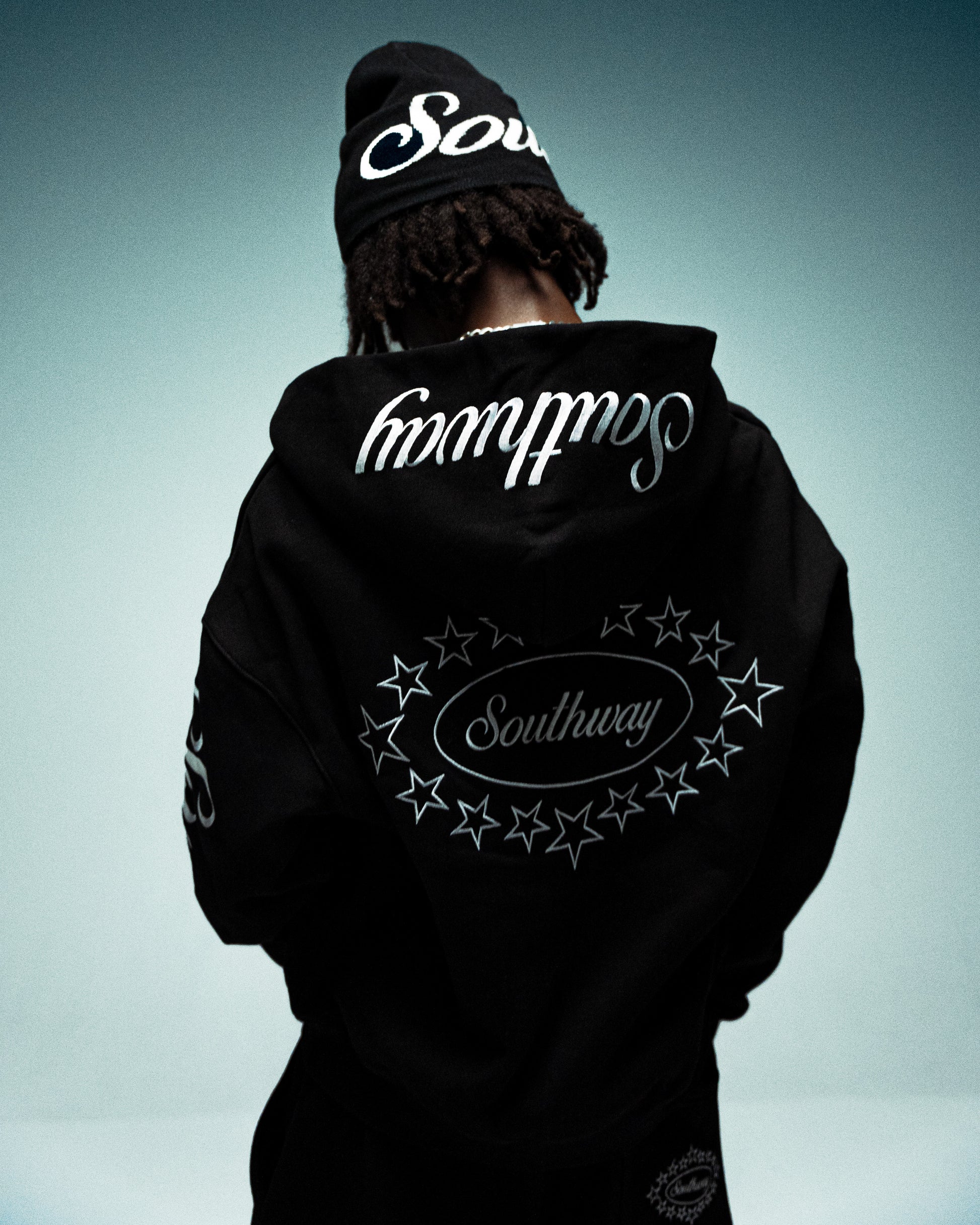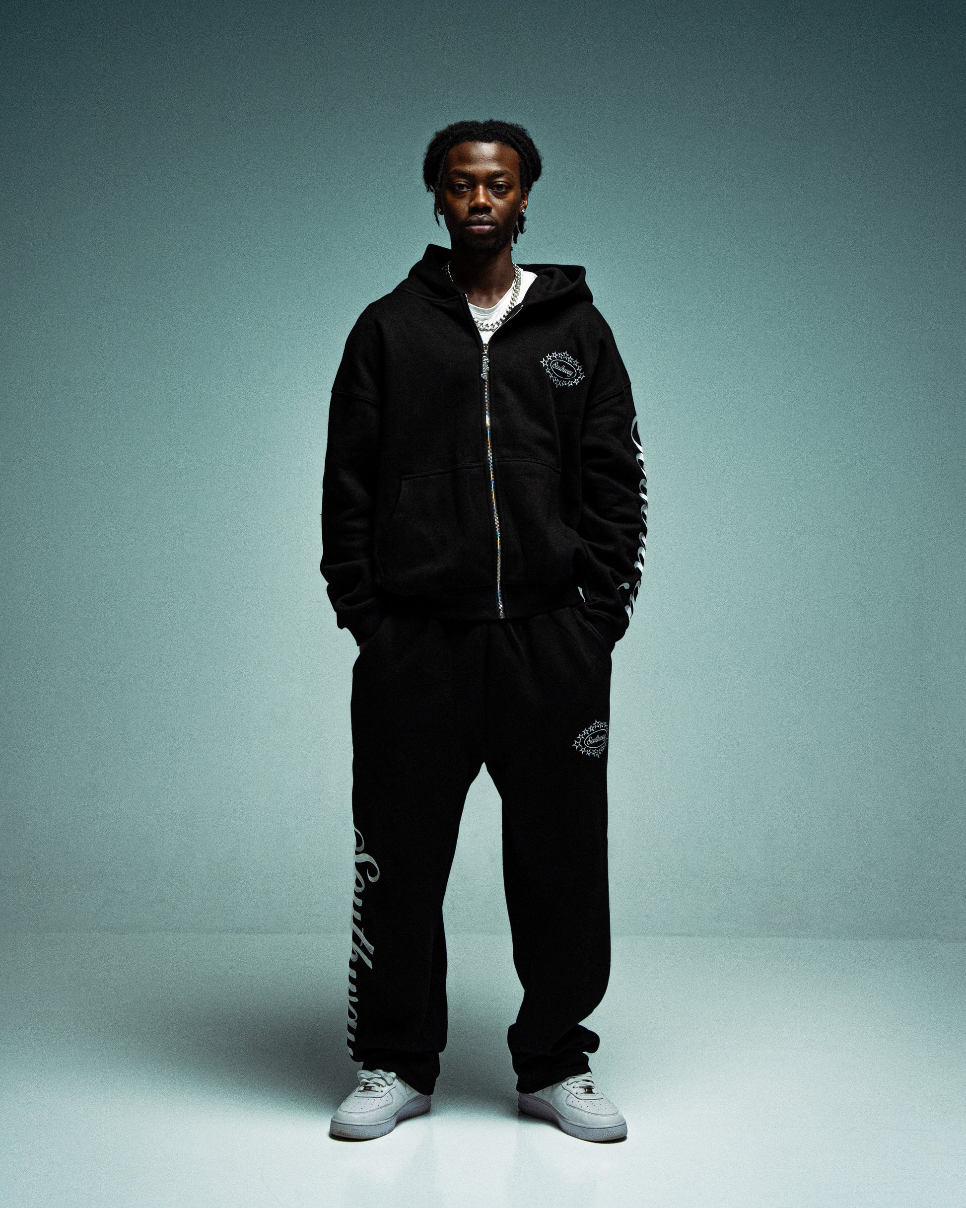 HEAVY SOUTHWAY CREST LOGO TRACKSUIT HOODIE IN A STONE BLACK COLORWAY. EMBROIDERY LETTERING ON THE SLEEVE AND HOOD. EMBROIDERED CREST LOGO ON THE CHEST AND BACK. CUSTOM ZIP LOGO PULLER IN SILVER.