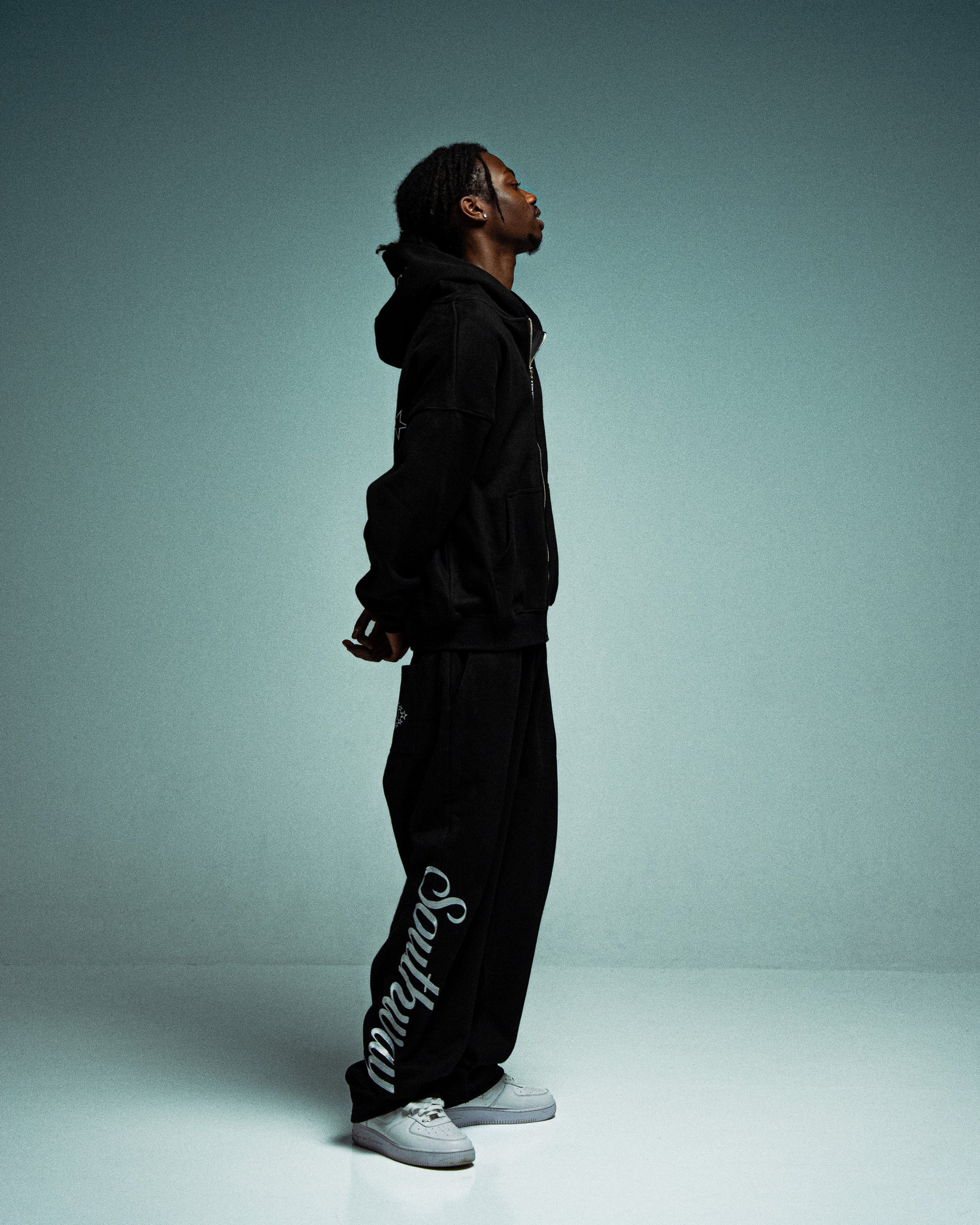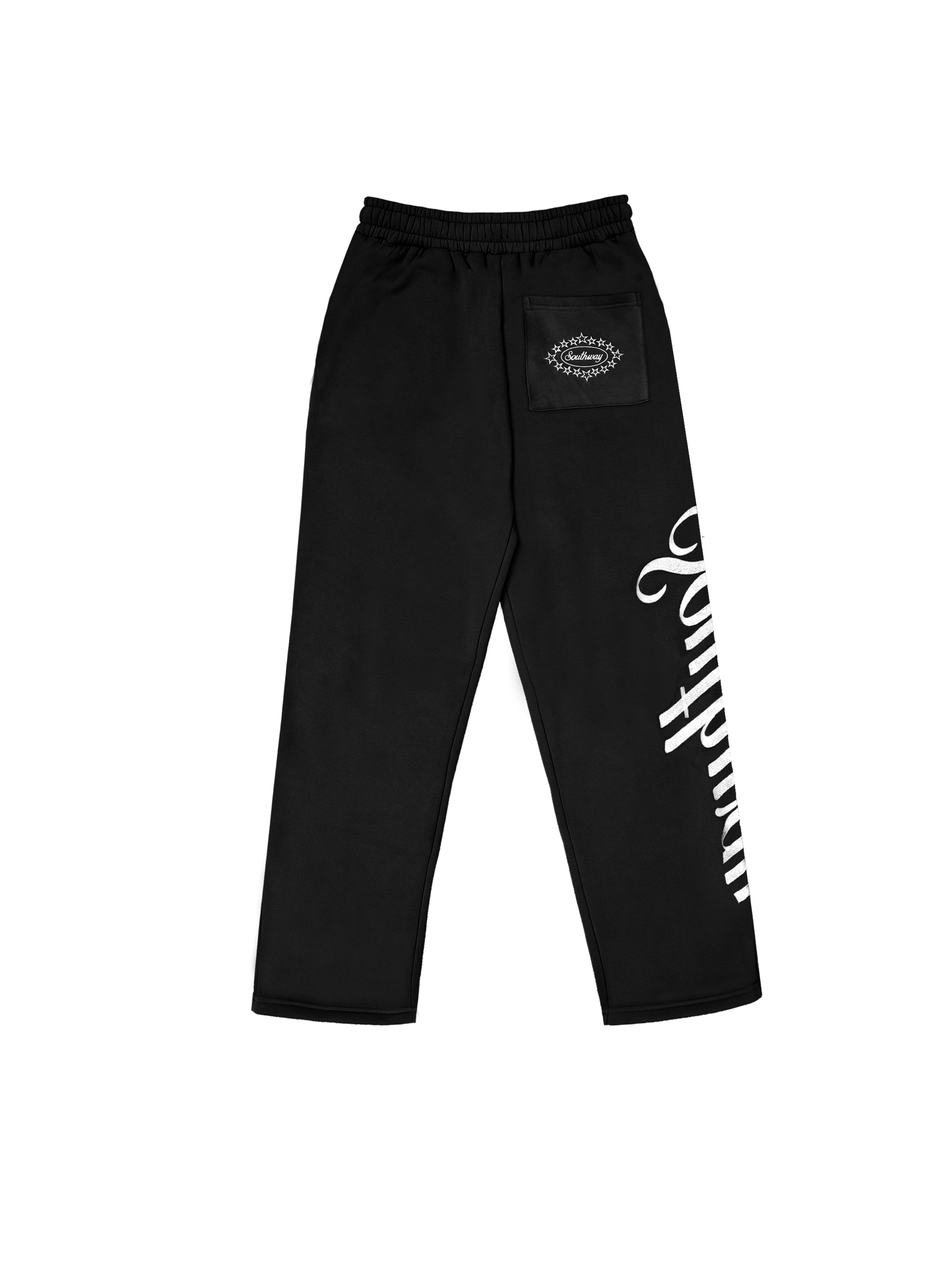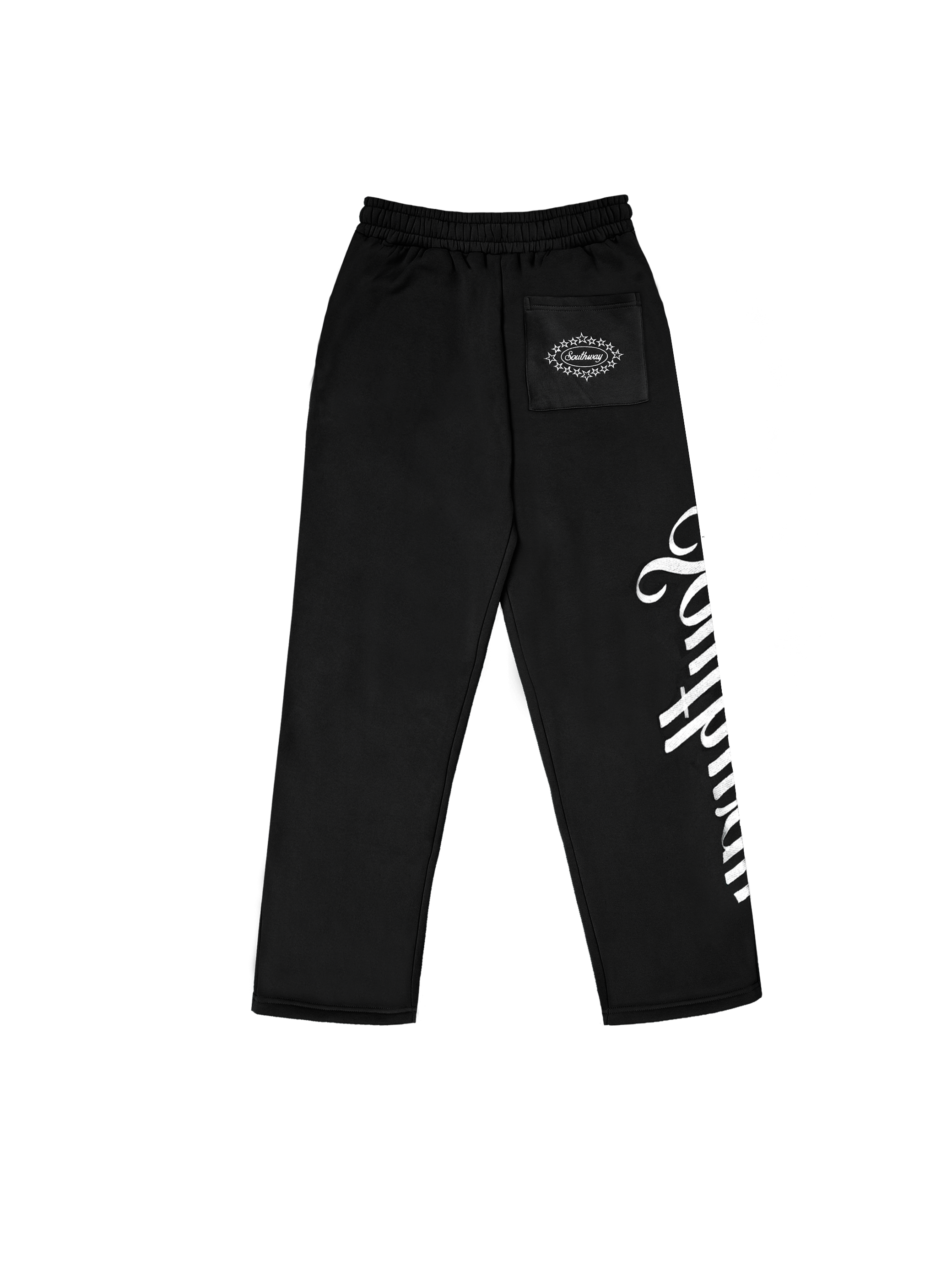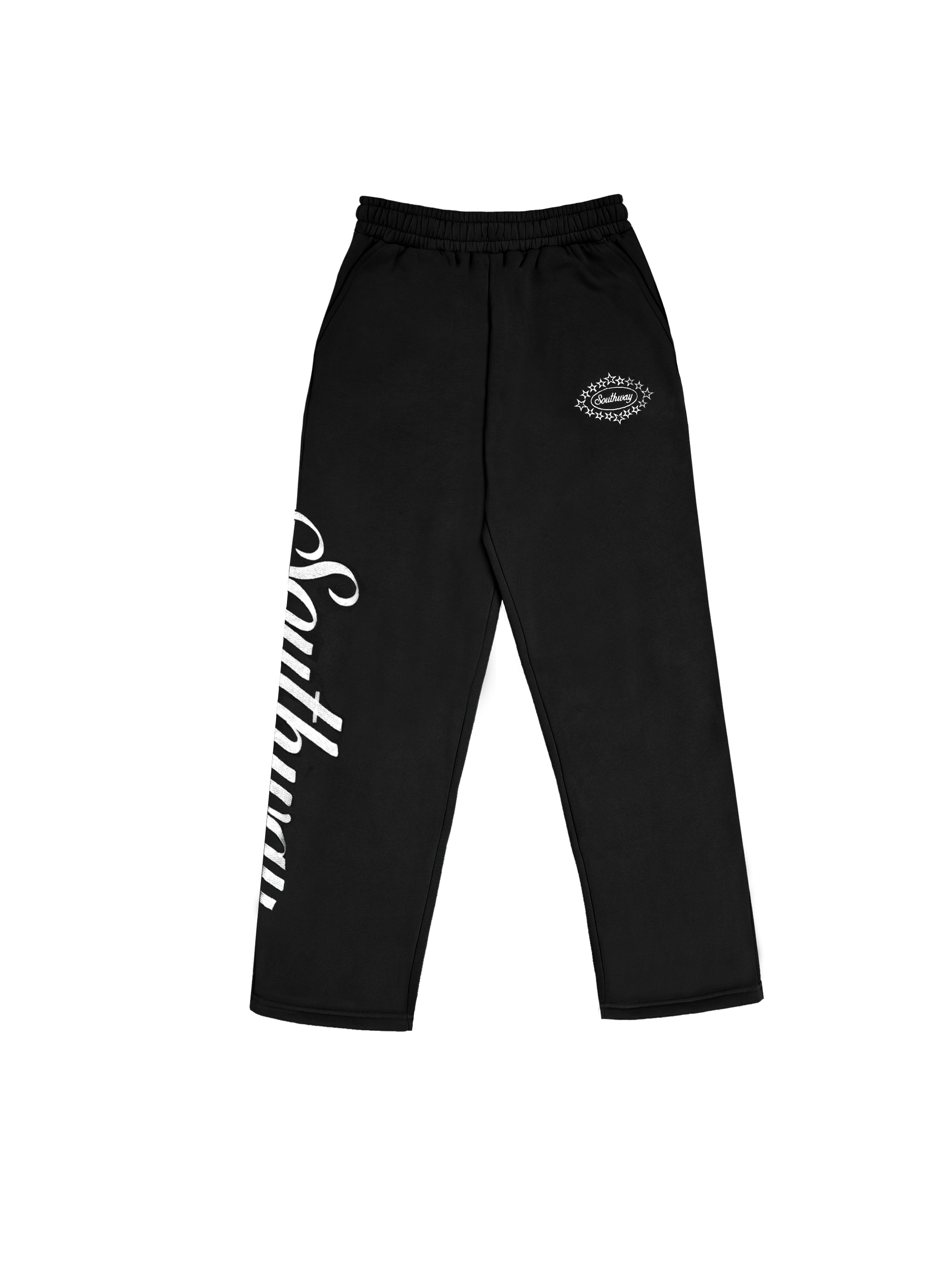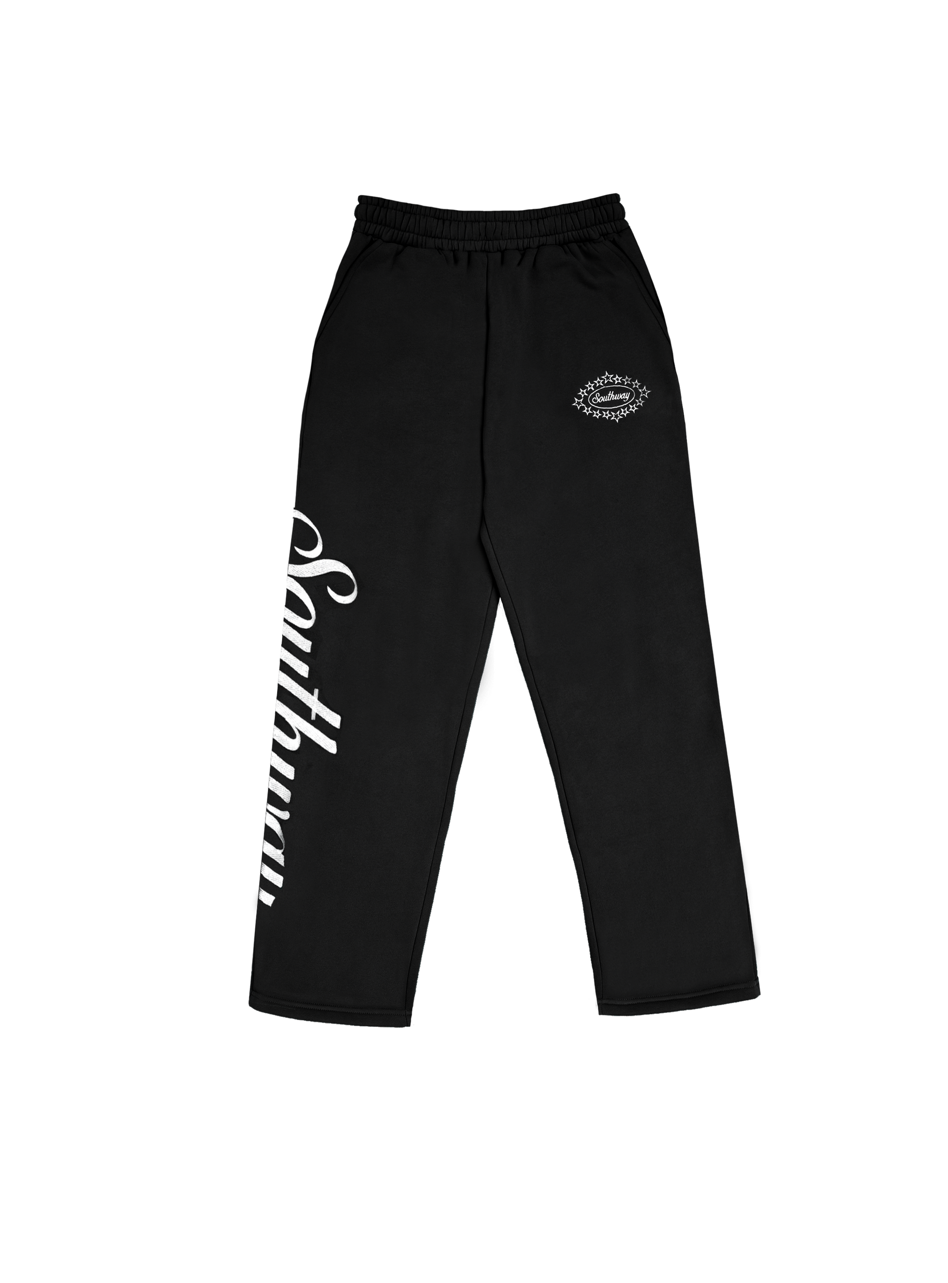 HEAVY SOUTHWAY CREST LOGO TRACKSUIT PANTS IN A STONE BLACK COLORWAY. EMBROIDERY LETTERING DOWN THE LEG. CREST LOGO ON THE LEG AND BACK POCKET.