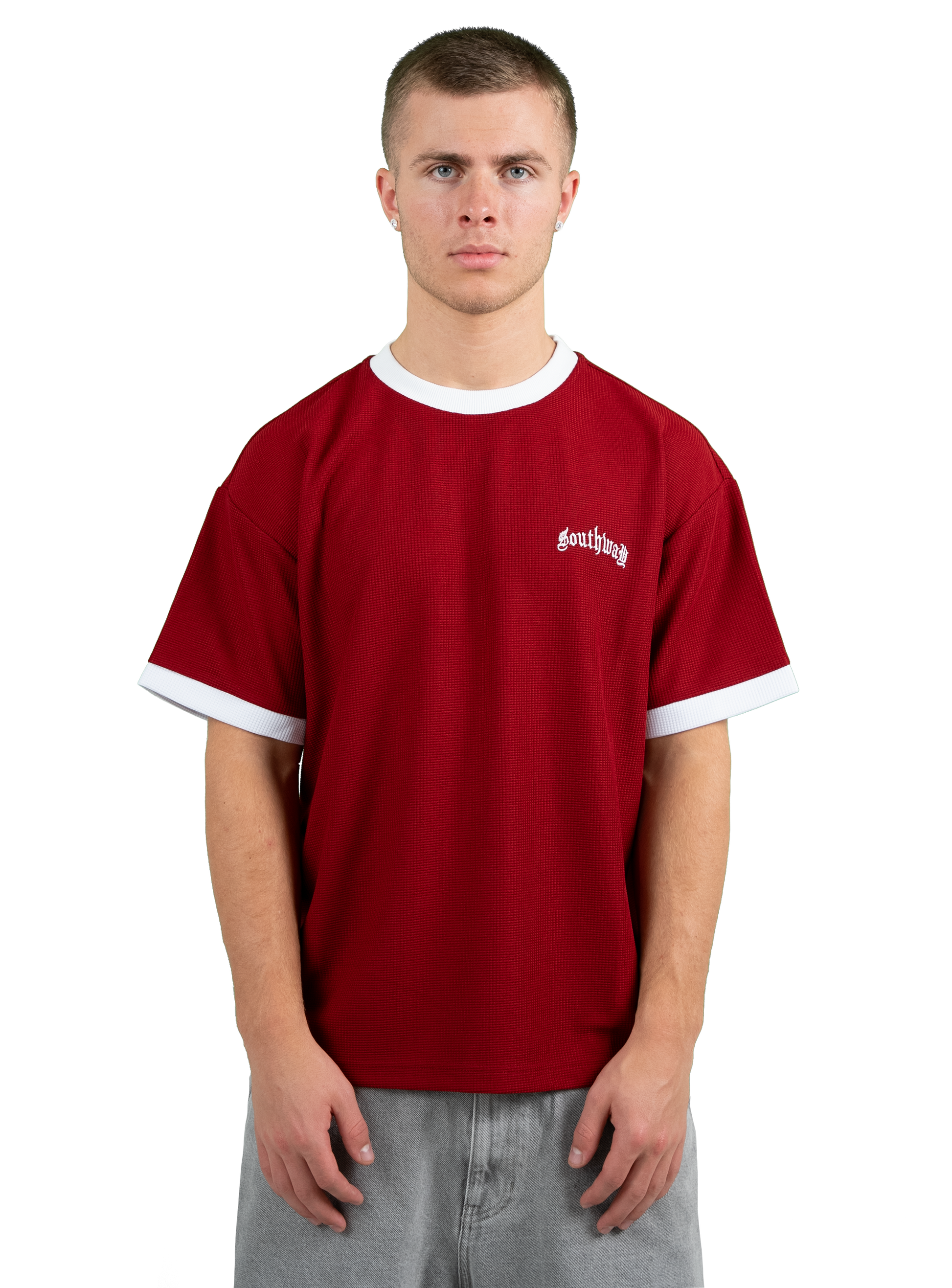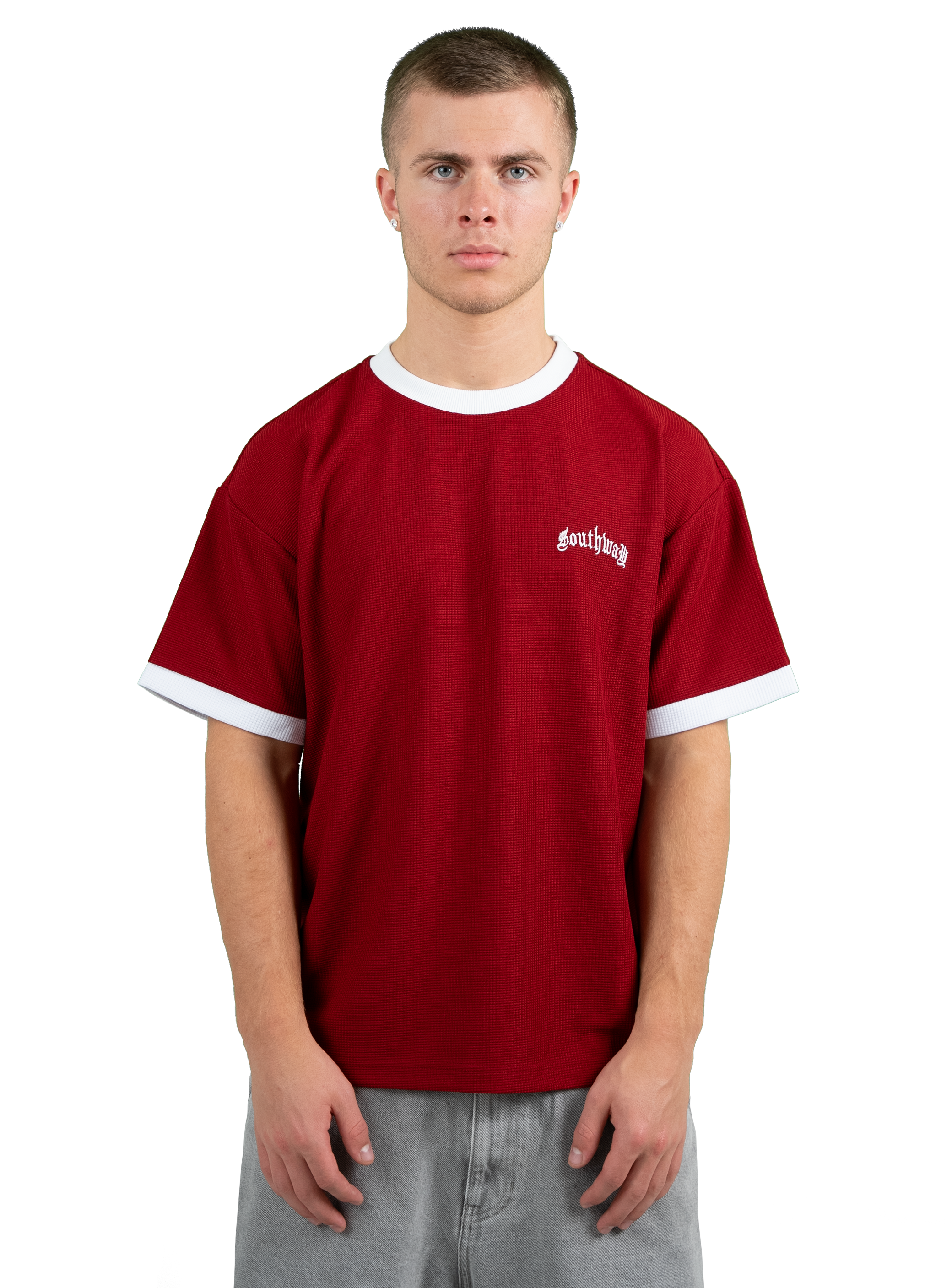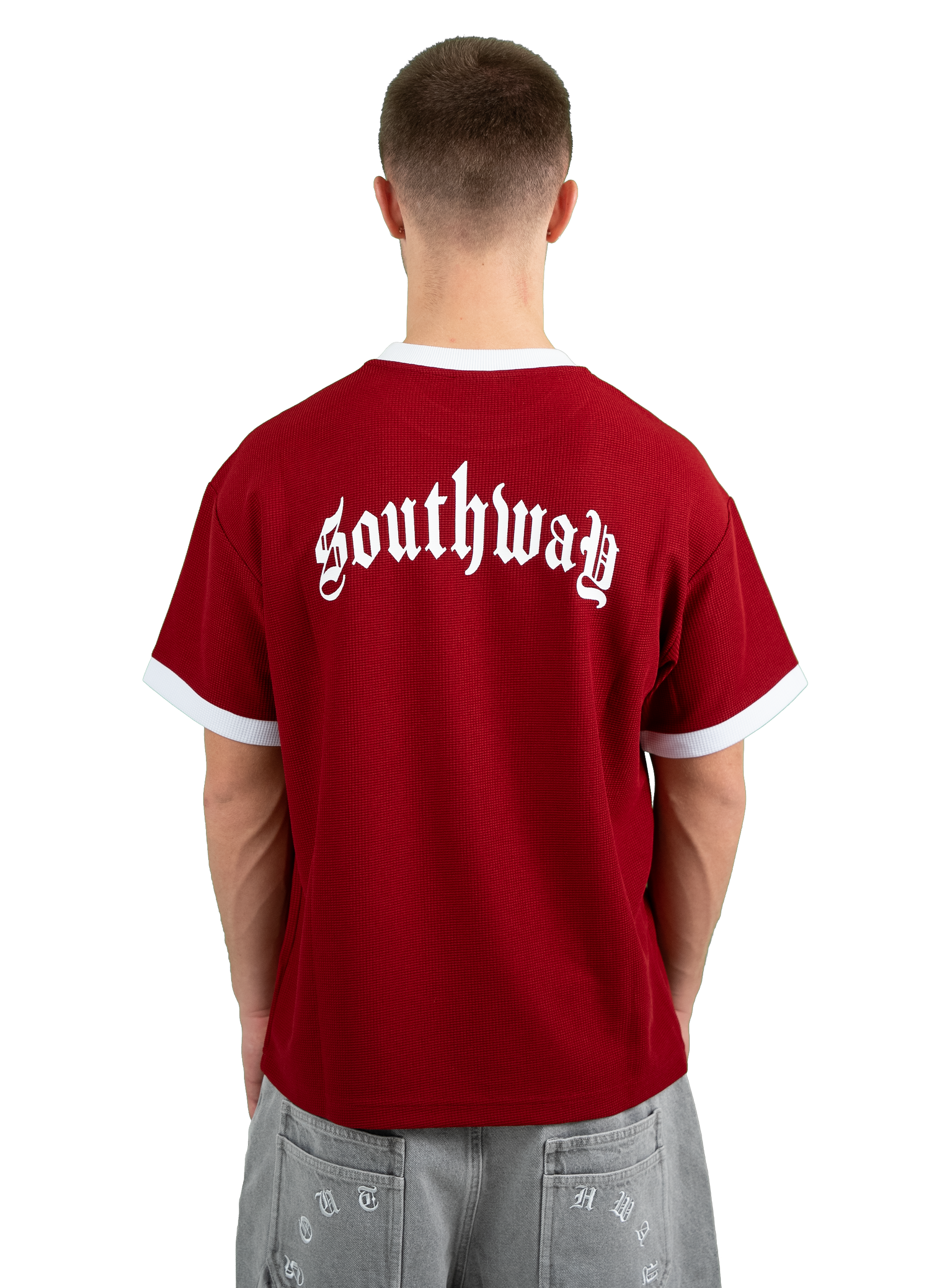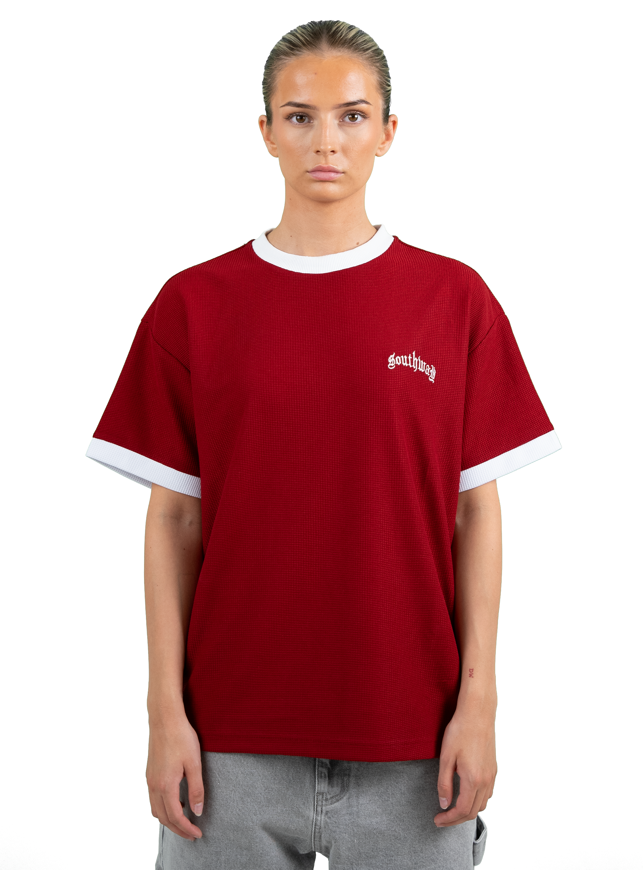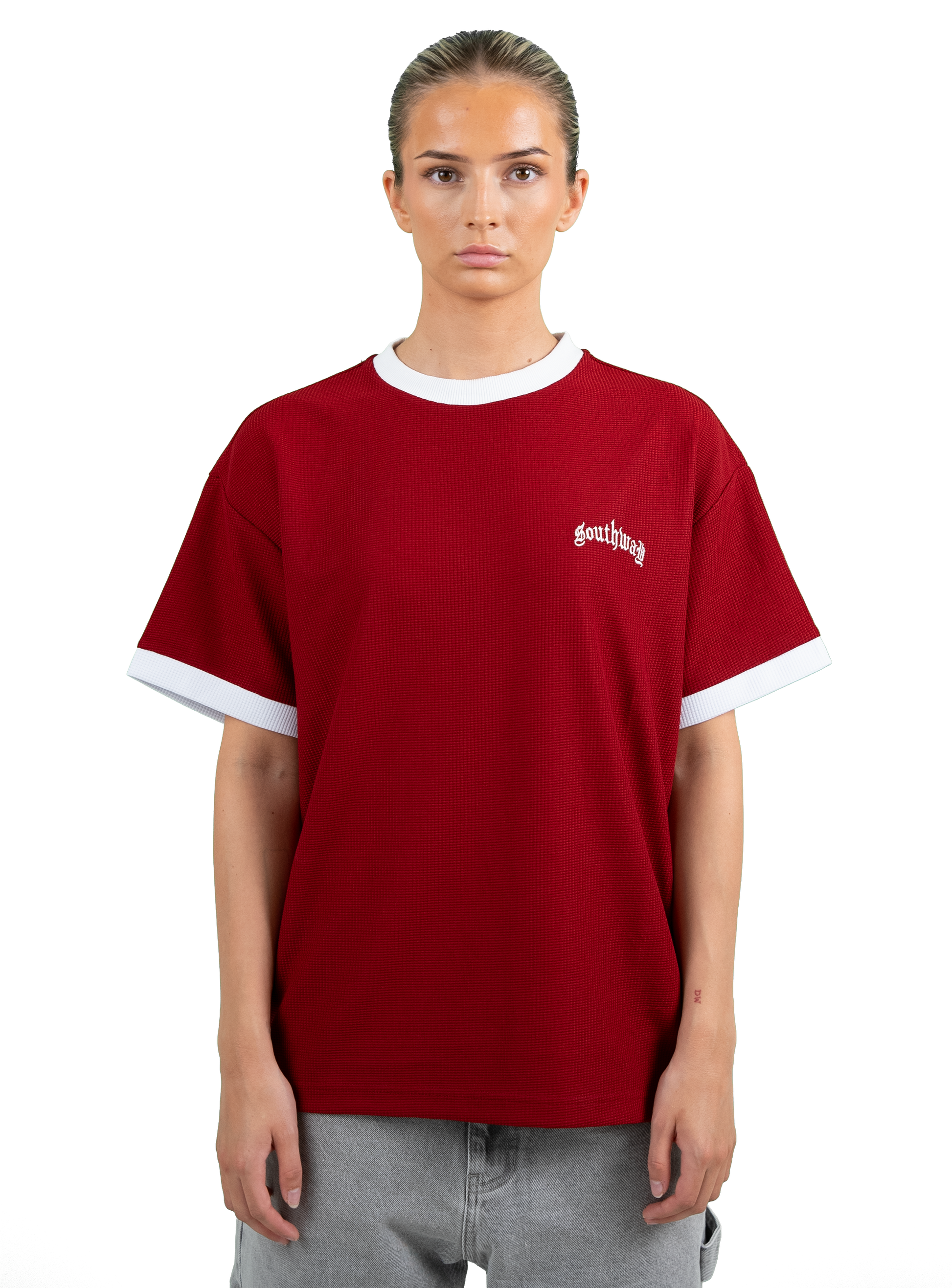 𝗪𝗜𝗡𝗘 𝗥𝗘𝗗 𝗪𝗔𝗙𝗙𝗟𝗘 𝗞𝗡𝗜𝗧 𝗧𝗘𝗘 SOUTHWAY LOGO EMBROIDERED ON THE FRONT & PRINTED ON THE BACK. WHITE HEM ON THE SLEEVE OPENING AND A WHITE RIBBED NECK. 𝗠𝗔𝗧𝗘𝗥𝗜𝗔𝗟𝗦 95% POLYESTER 5% SPANDEX BOXY FIT.