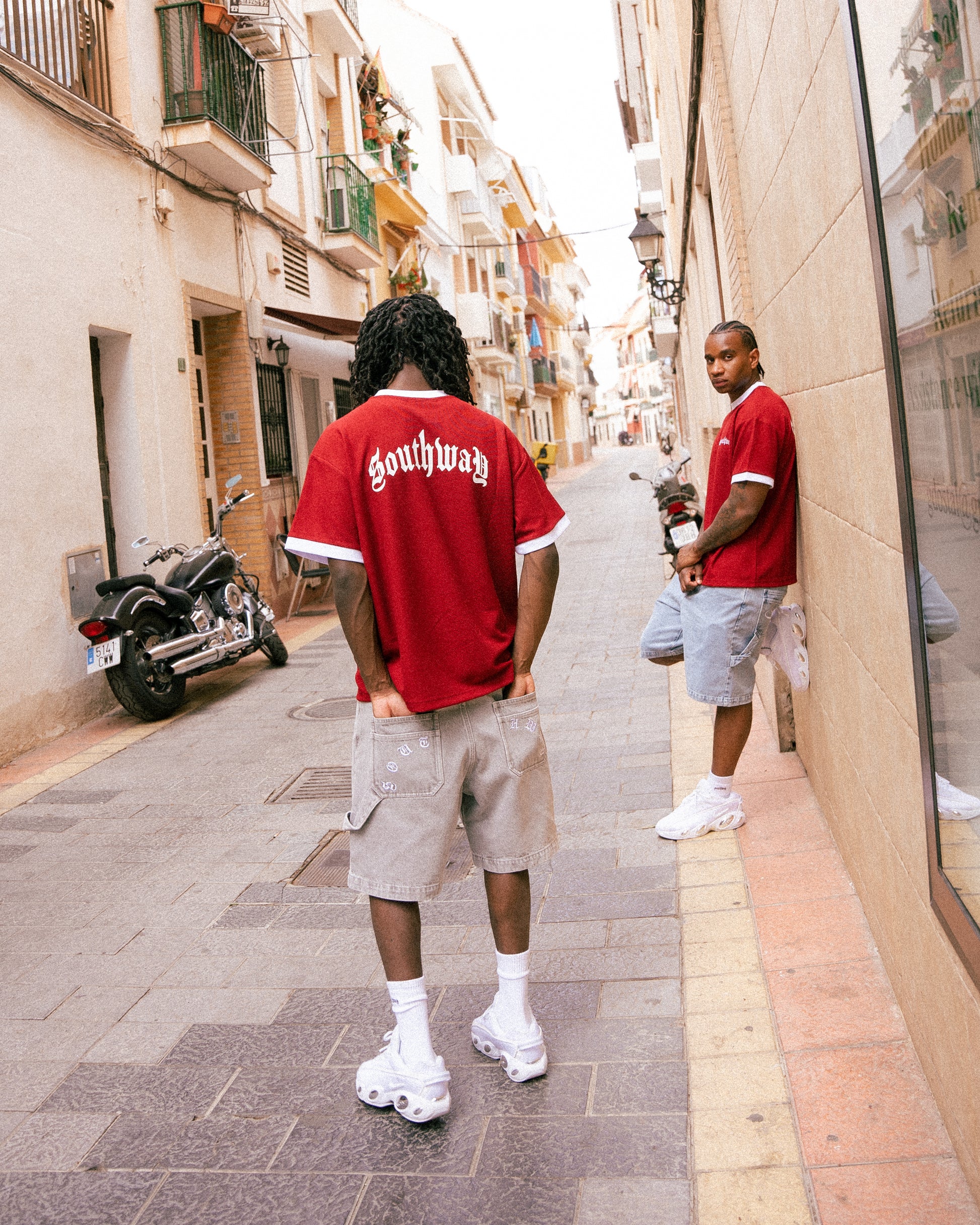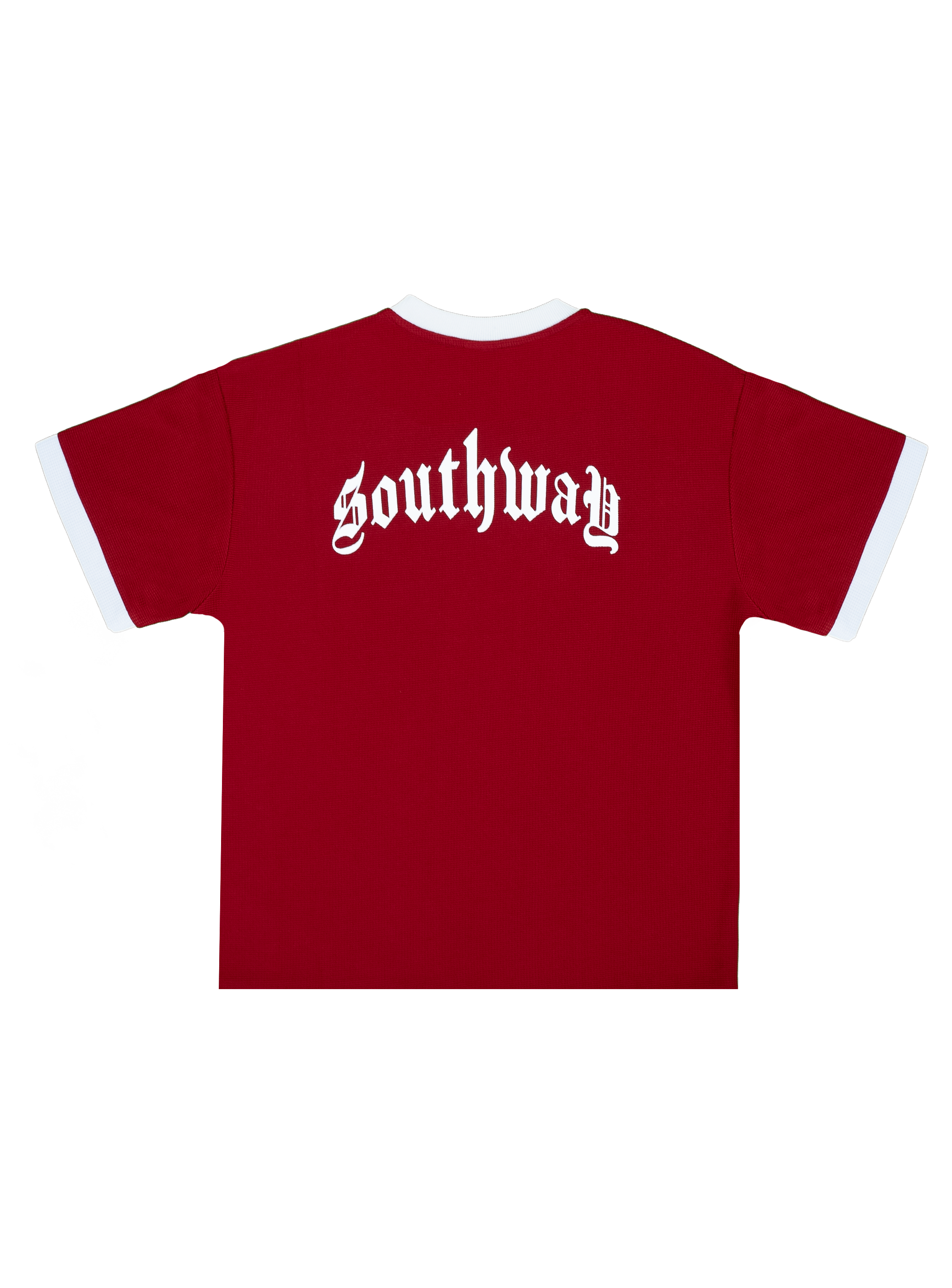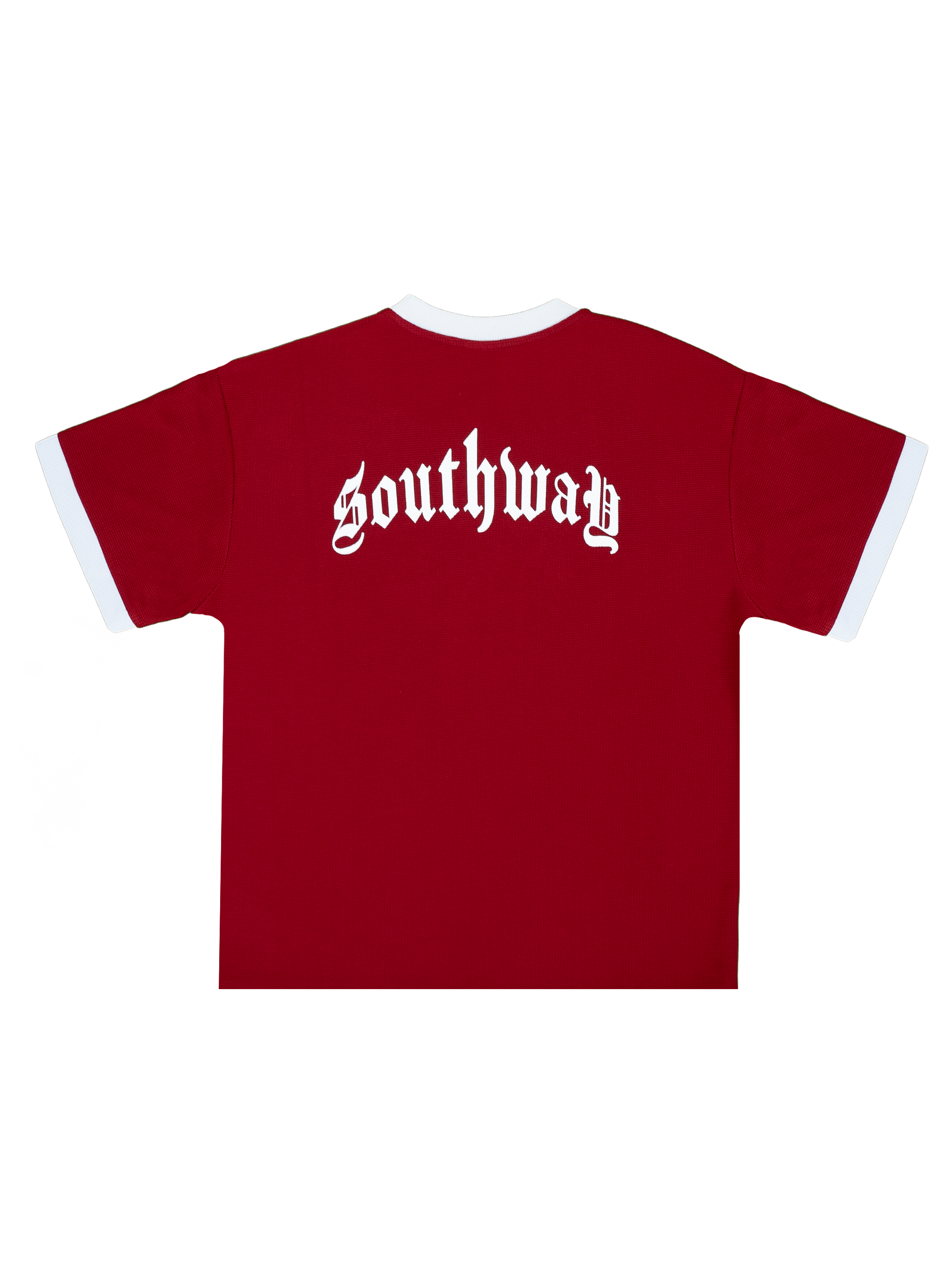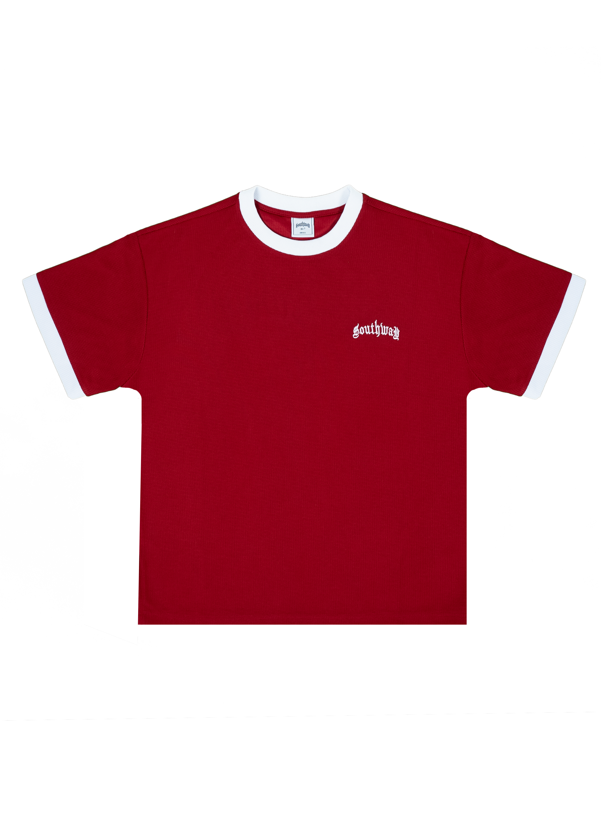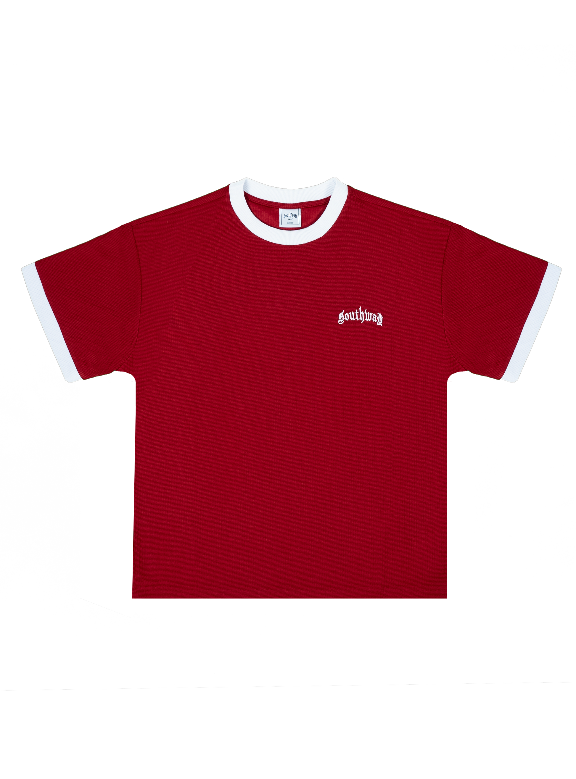 𝗪𝗜𝗡𝗘 𝗥𝗘𝗗 𝗪𝗔𝗙𝗙𝗟𝗘 𝗞𝗡𝗜𝗧 𝗧𝗘𝗘 SOUTHWAY LOGO EMBROIDERED ON THE FRONT & PRINTED ON THE BACK. WHITE HEM ON THE SLEEVE OPENING AND A WHITE RIBBED NECK. 𝗠𝗔𝗧𝗘𝗥𝗜𝗔𝗟𝗦 95% POLYESTER 5% SPANDEX BOXY FIT.